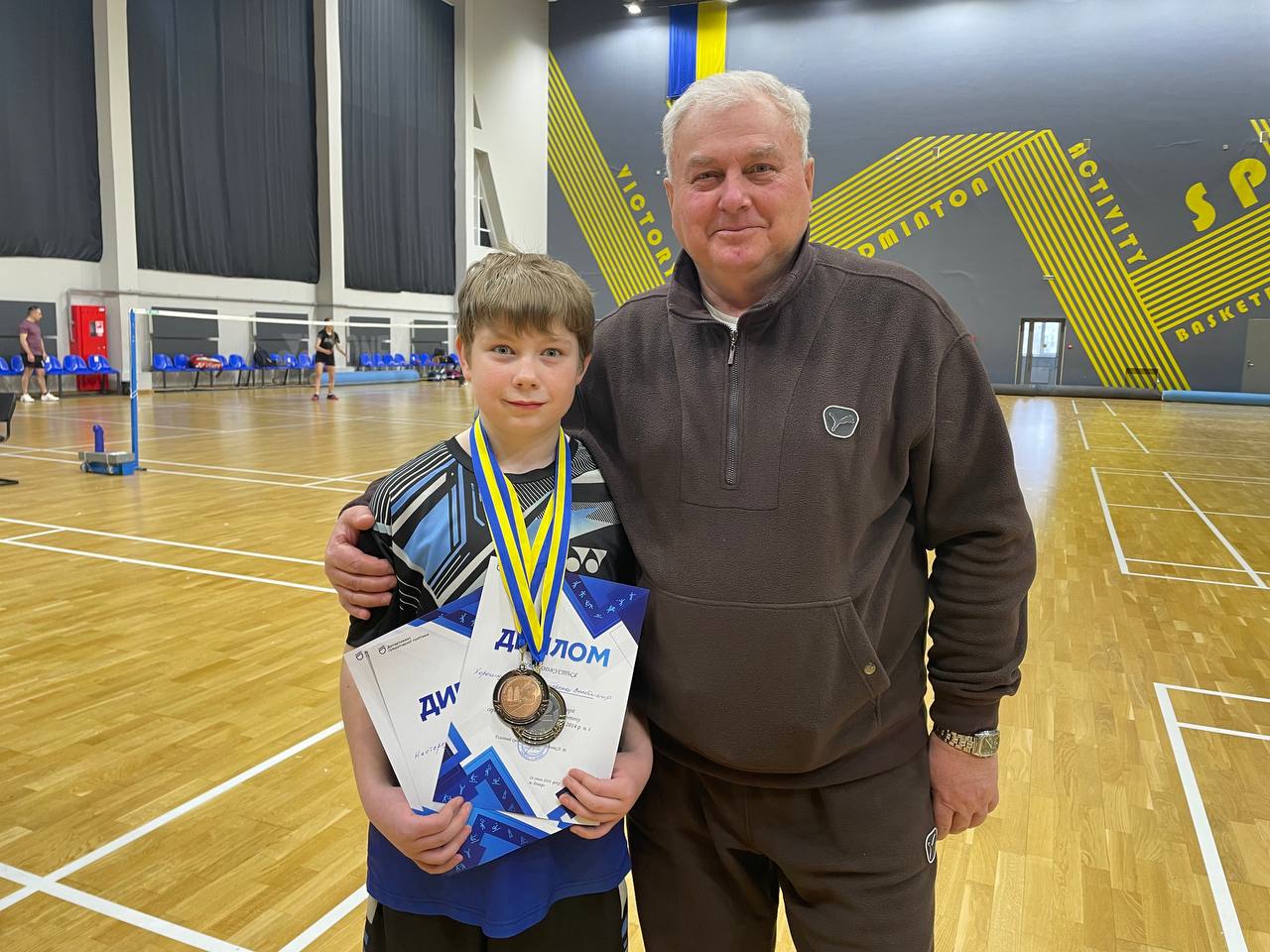 У спортивній залі стоїть тренер. Пригортає хлопчика, який в руках тримає дипломи, нагороджений медалями.