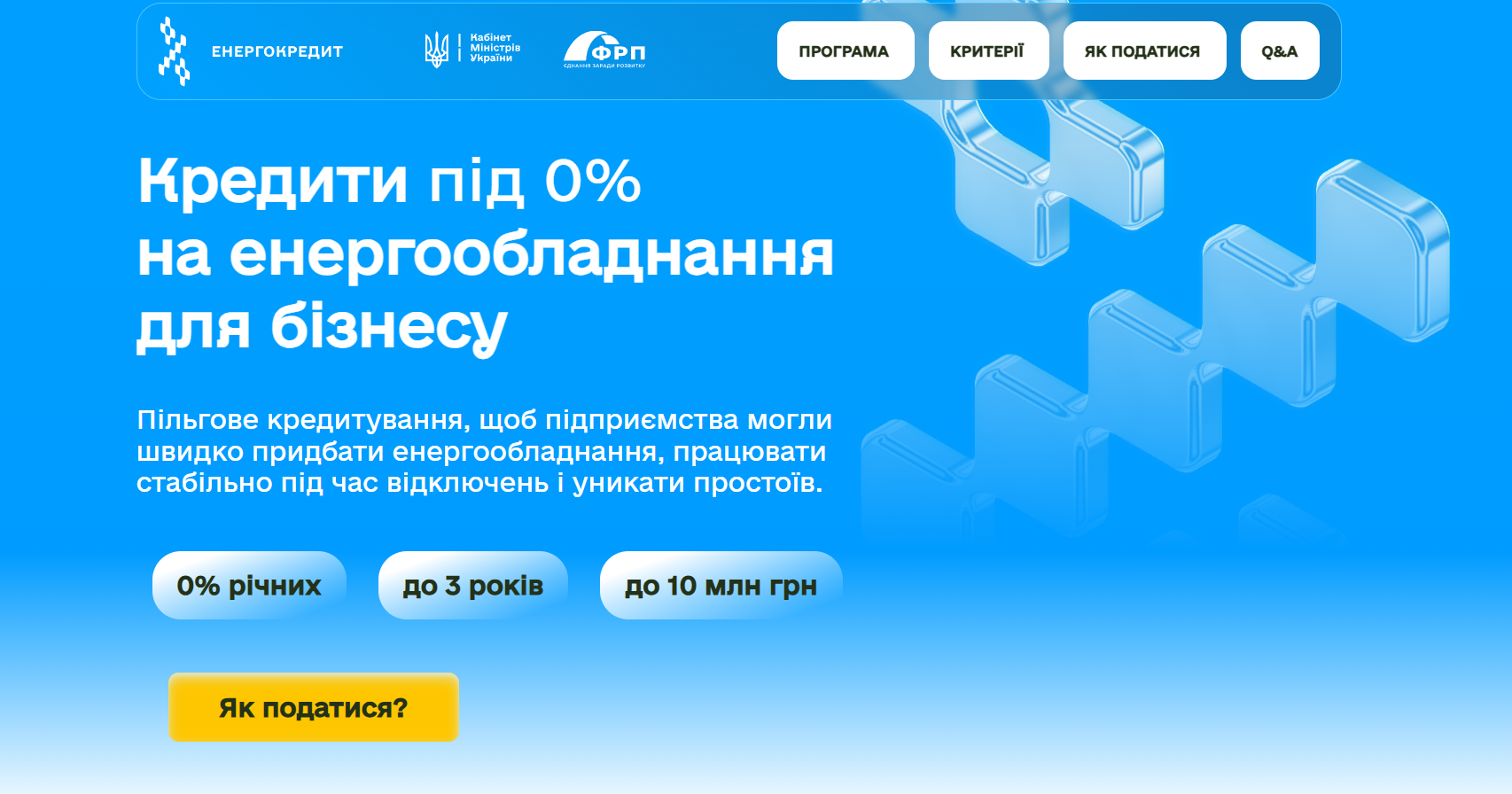 Мікро-, малий та середній бізнес може отримати до 10 млн грн пільгового кредитування під 0% річних у межах програми «Доступні кредити 5–7–9». Різницю банкам компенсує держава через Фонд розвитку підприємництва. Кредит надається до 3 років. Кошти можна спрямувати на генераційне обладнання — когенера…