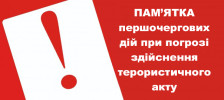 АЛГОРИТМ першочергових дій при погрозі здійснення терористичного акту Будь-яке повідомлення (в тому числі анонімне) про загрозу вчинення терористичного акту, передане по телефону, в письмовому вигляді, особисто або в будь-якій іншій формі, має розглядатися як реальна загроза життю та безпеці гром…