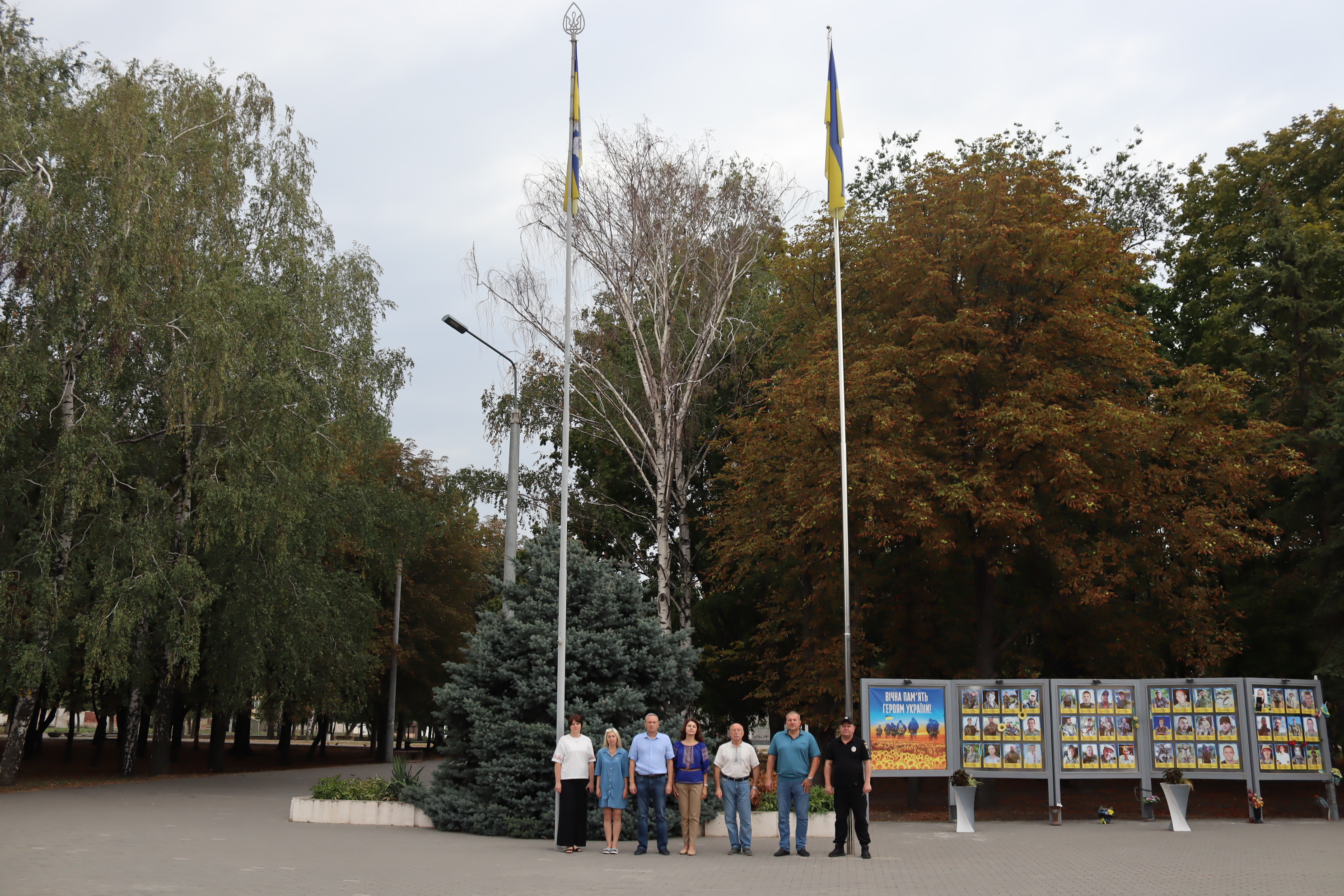 Міський голова Дмитро Зражевський, заступник голови Синельниківської районої військової адміністрації Тетяна Завалій, інші посадовці, представник поліції стоять на площі. За ними - пам'ятний стенд із фотографіями загиблих захисників України, два флагштоки із прапорами, паркова зона.