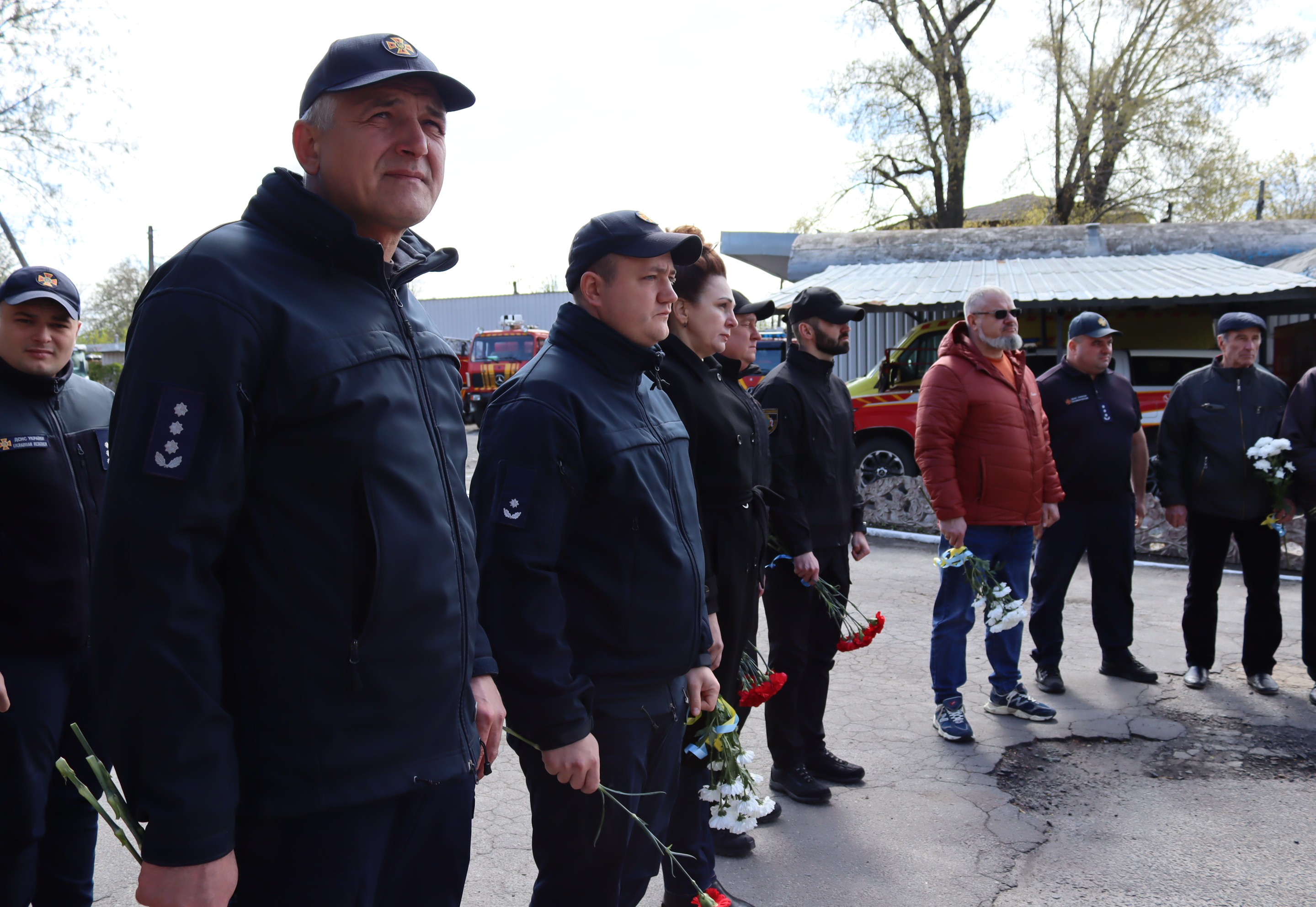 Рятувальники, правоохоронці стоять з квітами в руках.