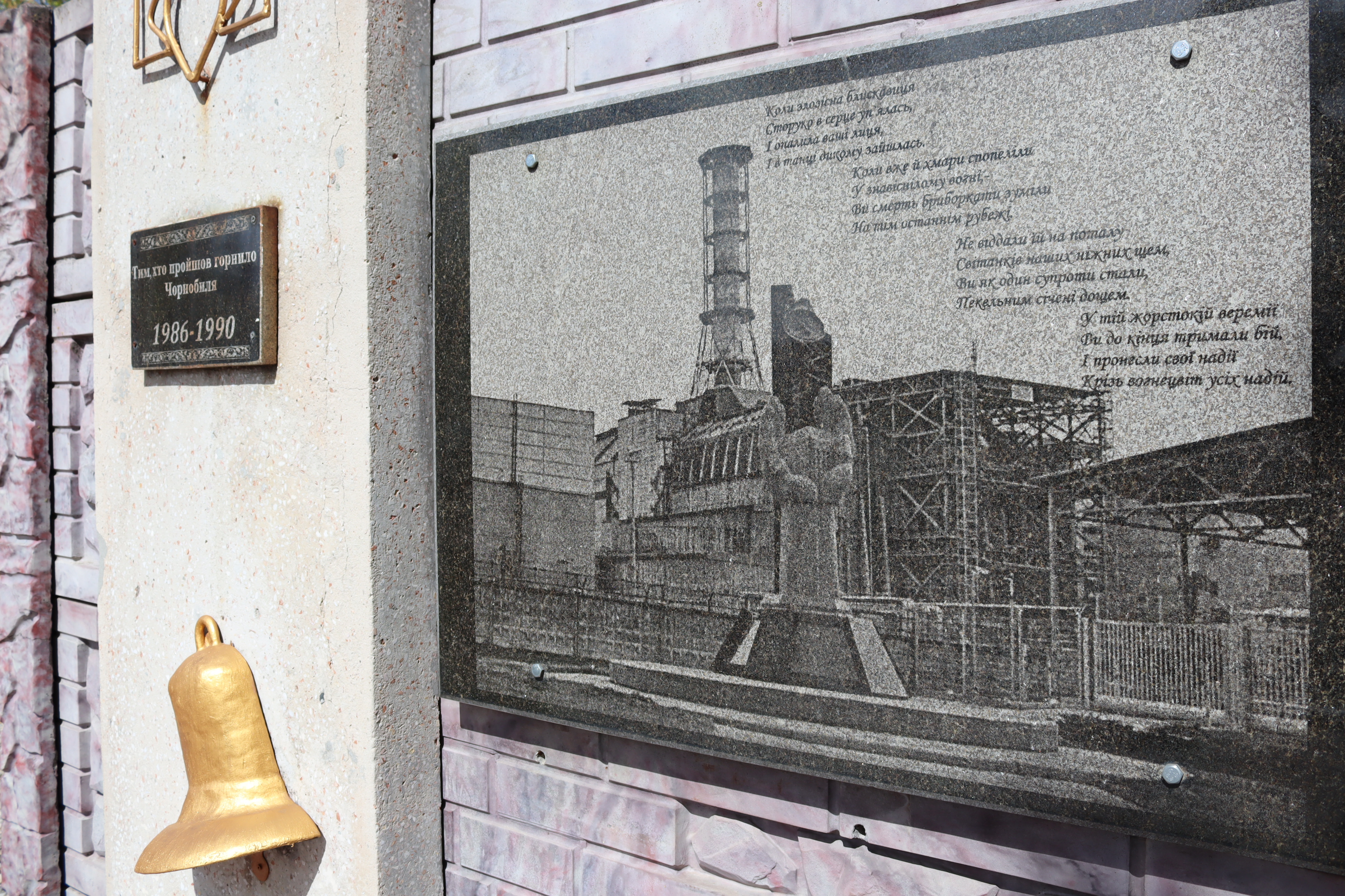 Фрагмент пам'ятного знака на честь ліквідаторів: фото енергоблока, символічний дзвін, дати.