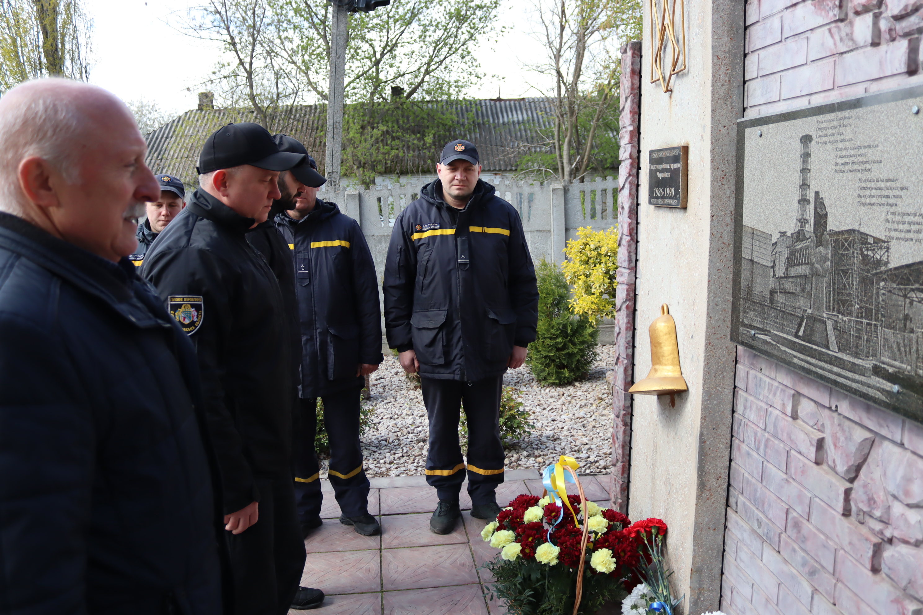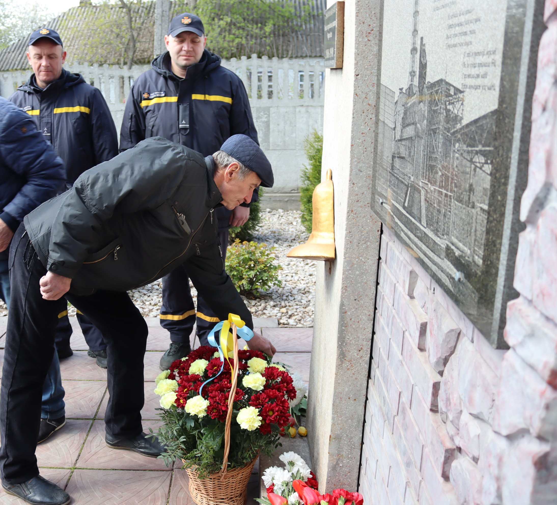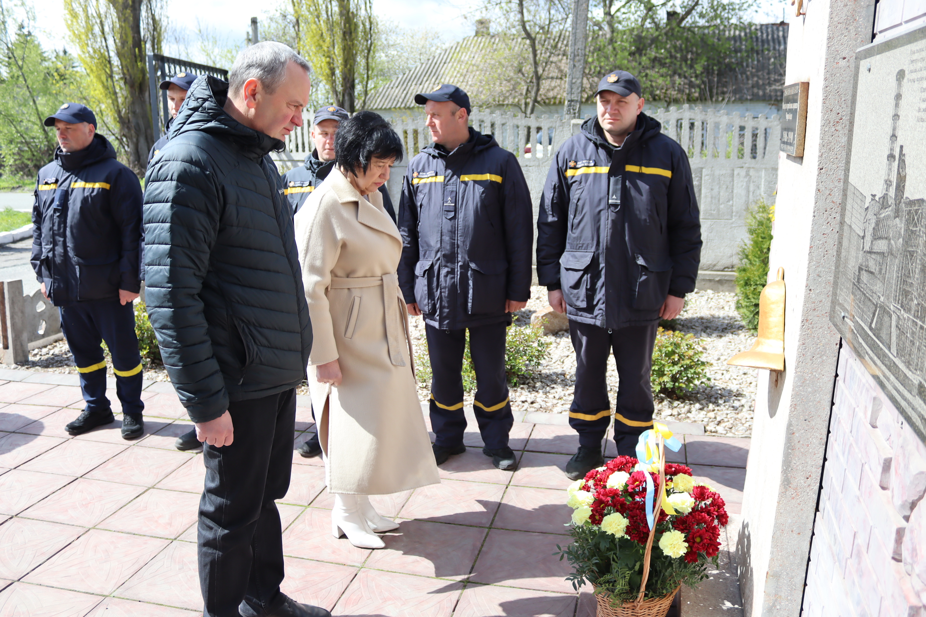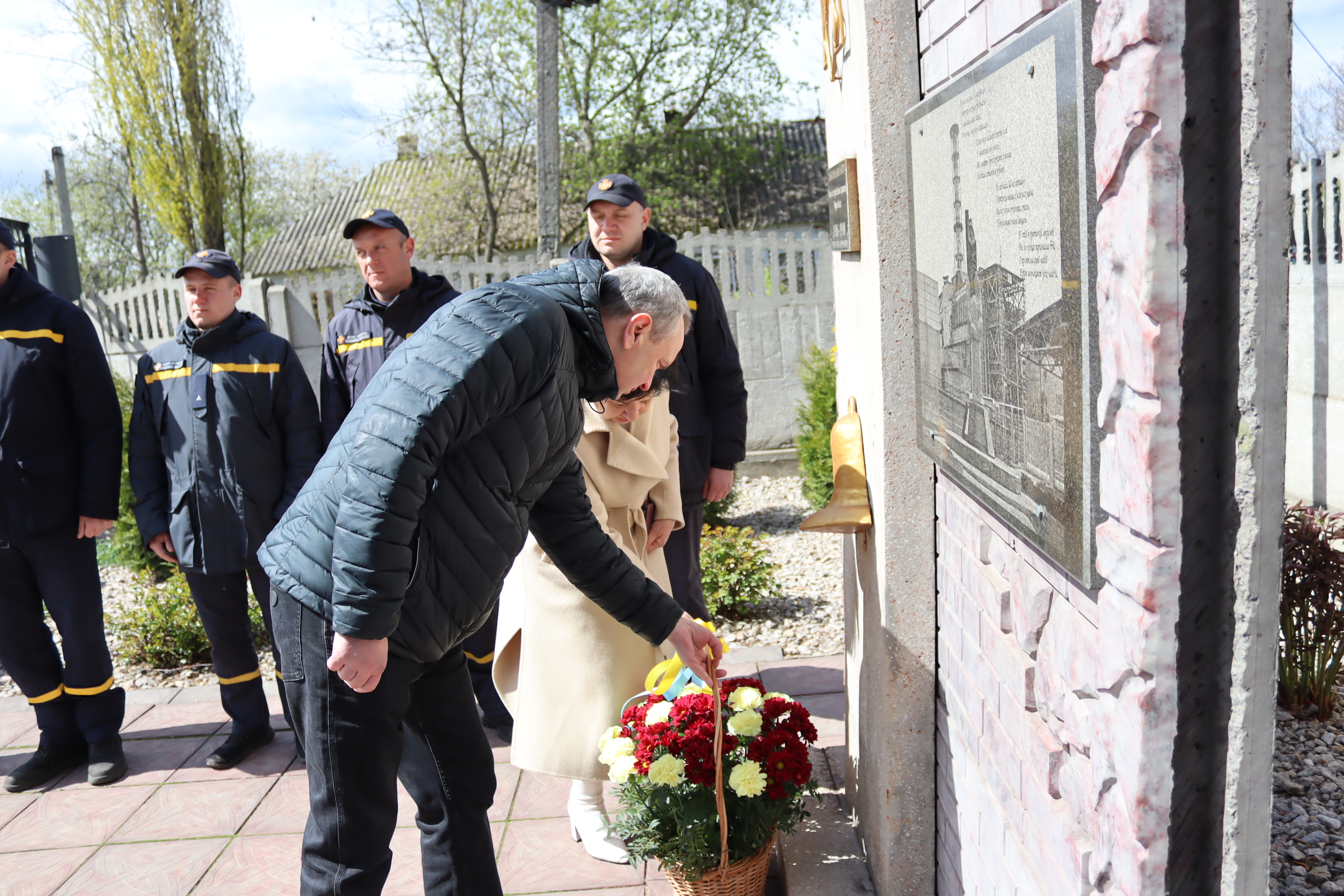 Наші сучасні герої - рятувальники поруч із пам'ятним знаком. У підніжжя - квіти.