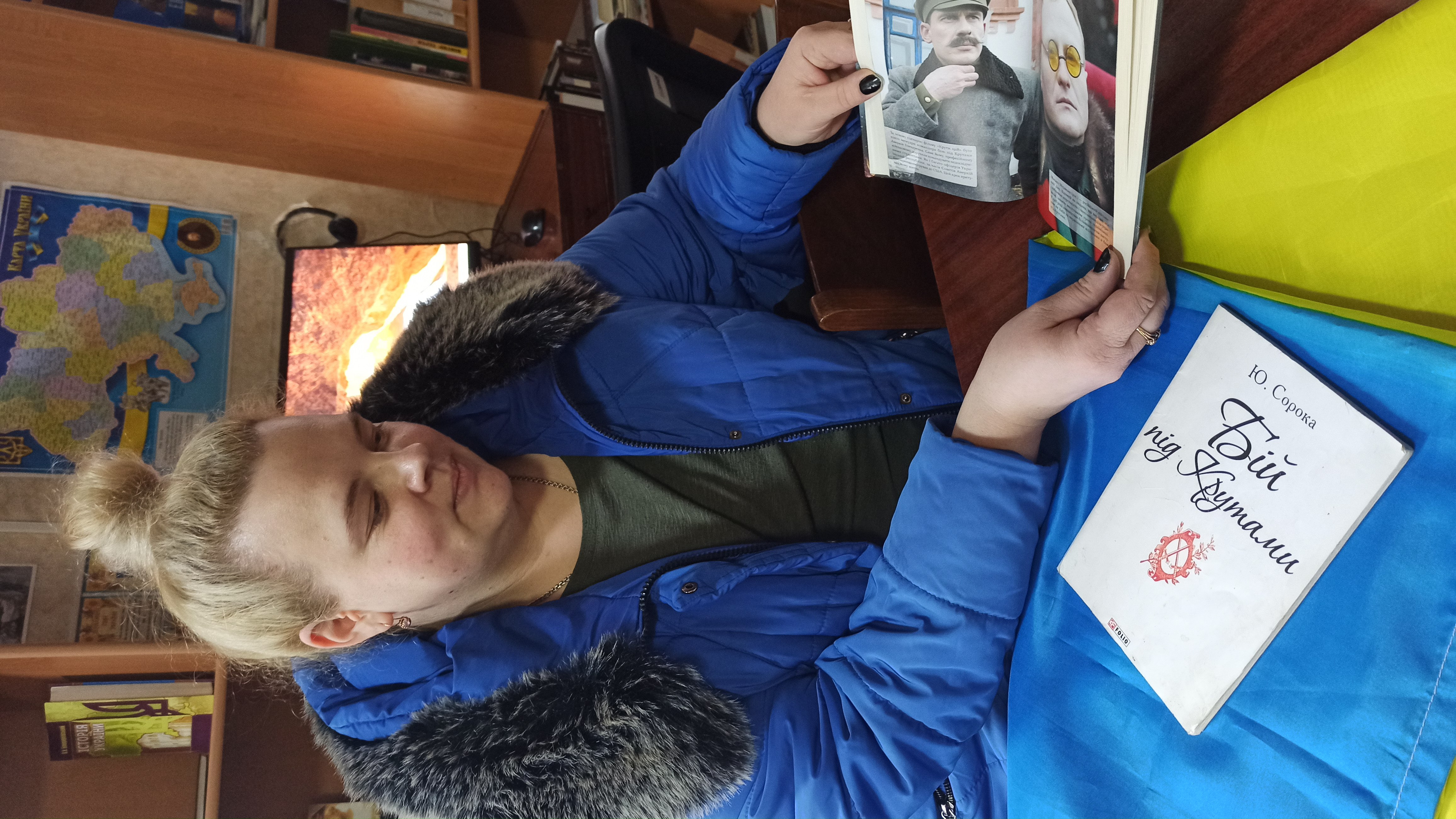 Відвідувачка бібліотеки тримає в руках книгу. Поряд на синьо-жовтому полотні лежить книга Ю.Сороки "Бій під Крутами"