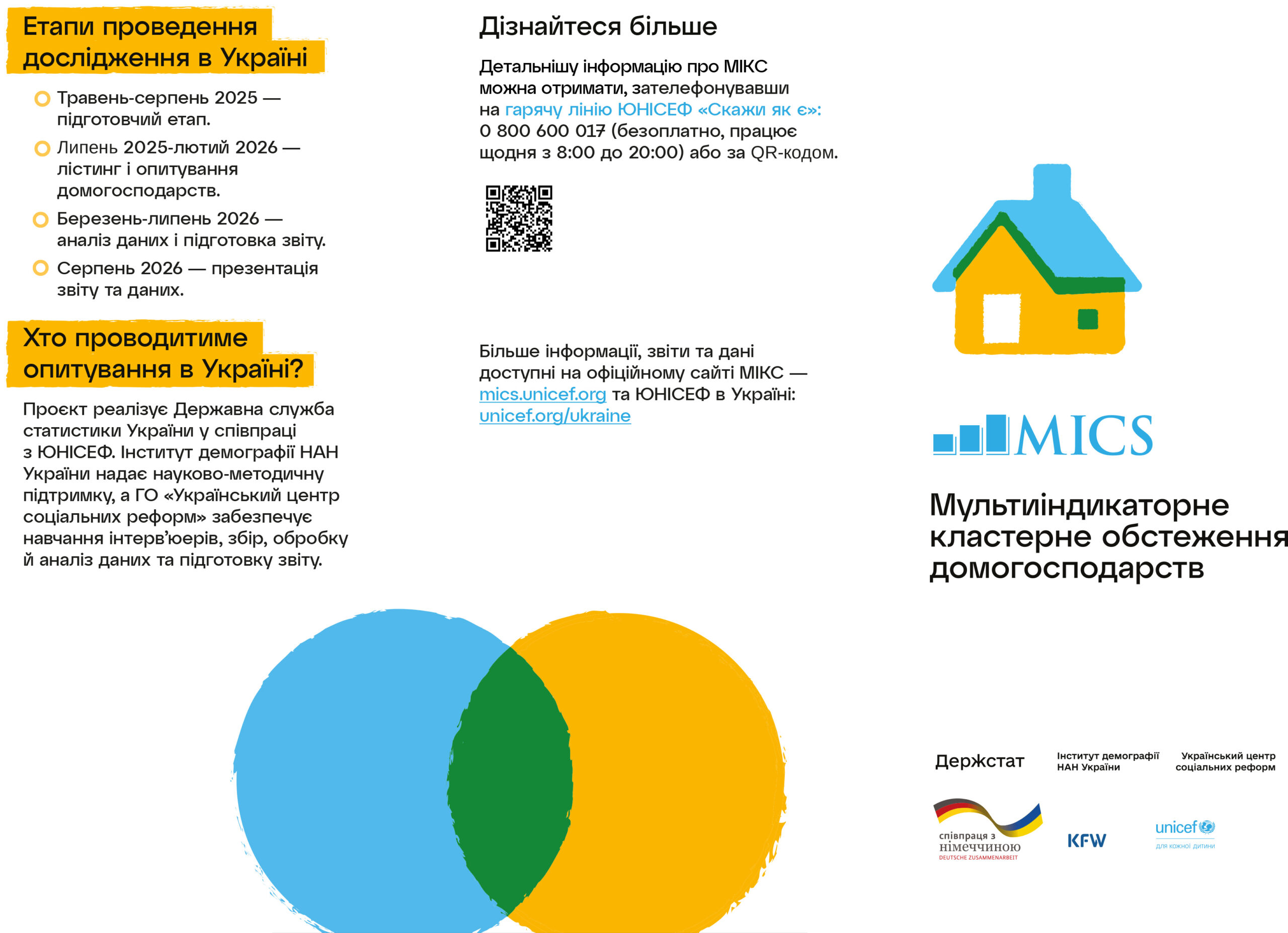 Державна служба статистики України разом із Інститутом демографії та досліджень якості життя імені Михайла Птухи НАН України та ГО "Український центр соціальних реформ", за підтримки Дитячого фонду ООН (ЮНІСЕФ) в Україні, розпочала реалізацію чергового раунду Мультиіндикаторного кластерного обстеження домогосподарств (МІКС) в Україні, організація та проведення якого передбачається протягом 2025-2026 років.