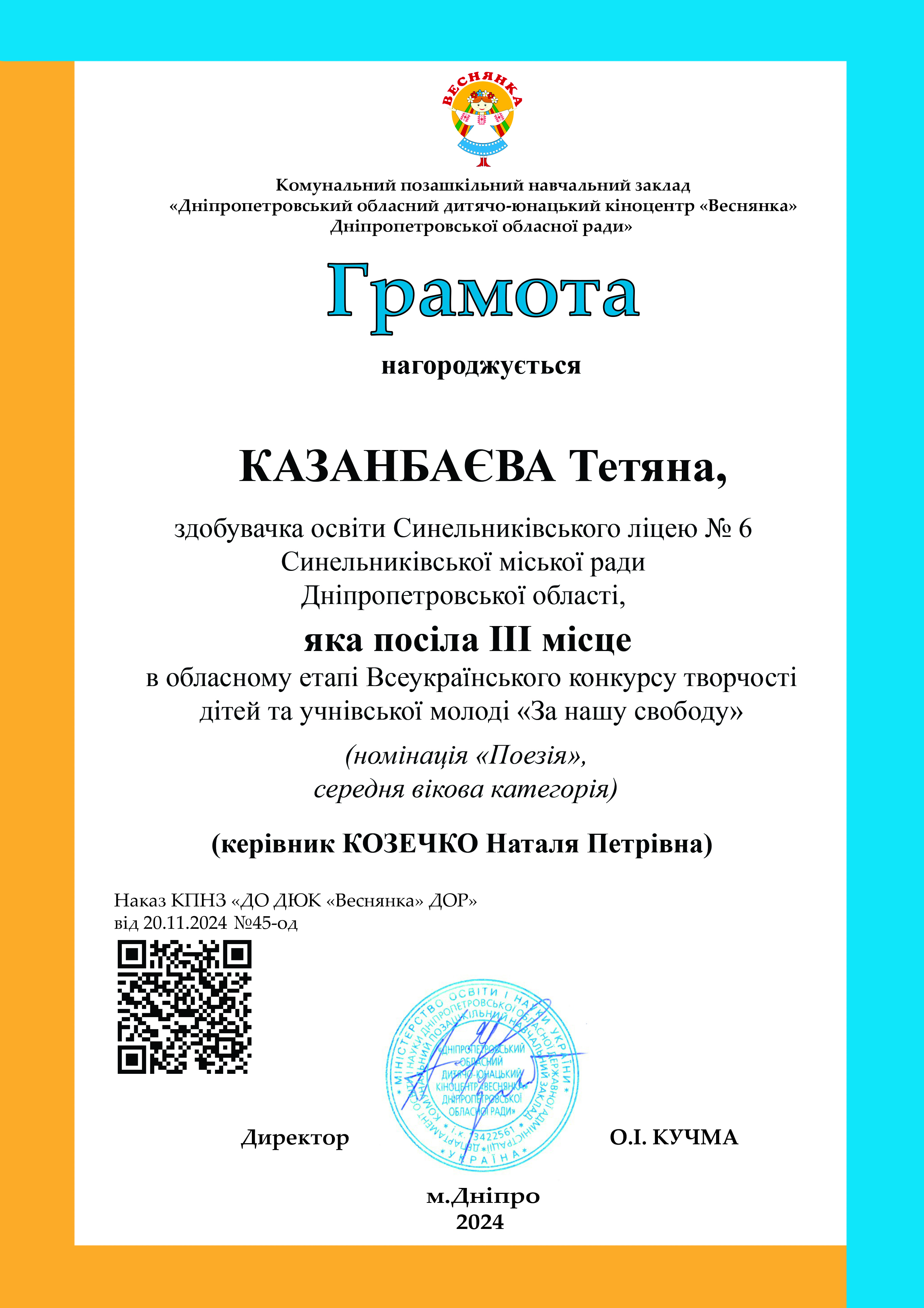 ІІІ місце – Казанбаєва Тетяна (вчитель Наталія Козечко), ліцей № 6.