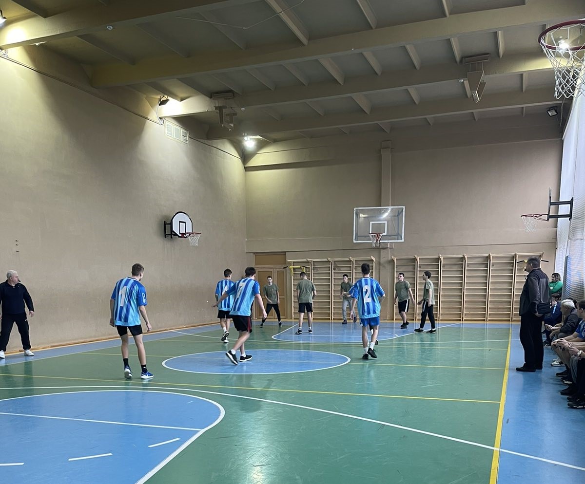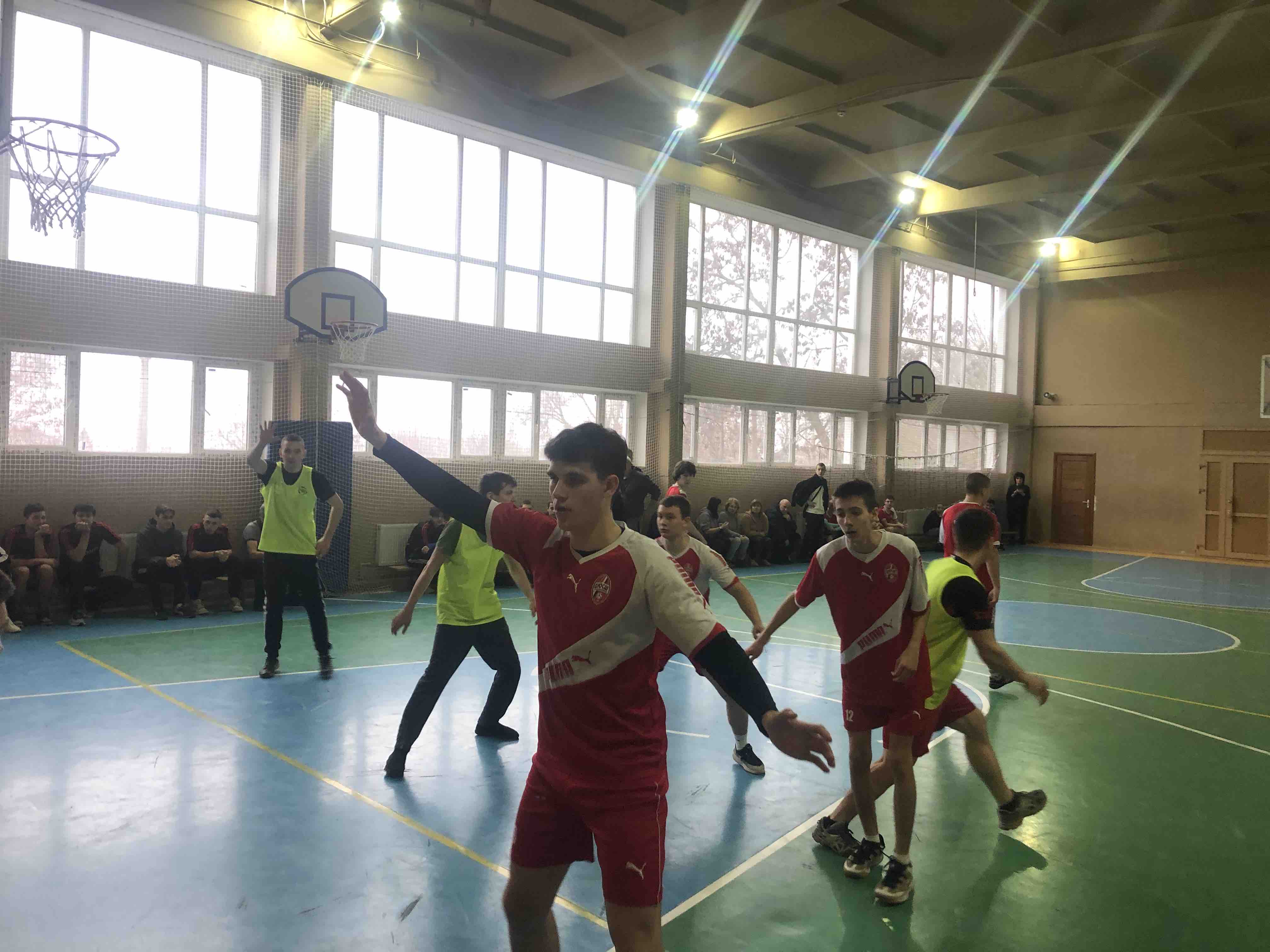 момент гри у спортивній залі, юнаки з двох команд біля баскетбольного кільця. Праворуч на лаві - представники ліцеїв.