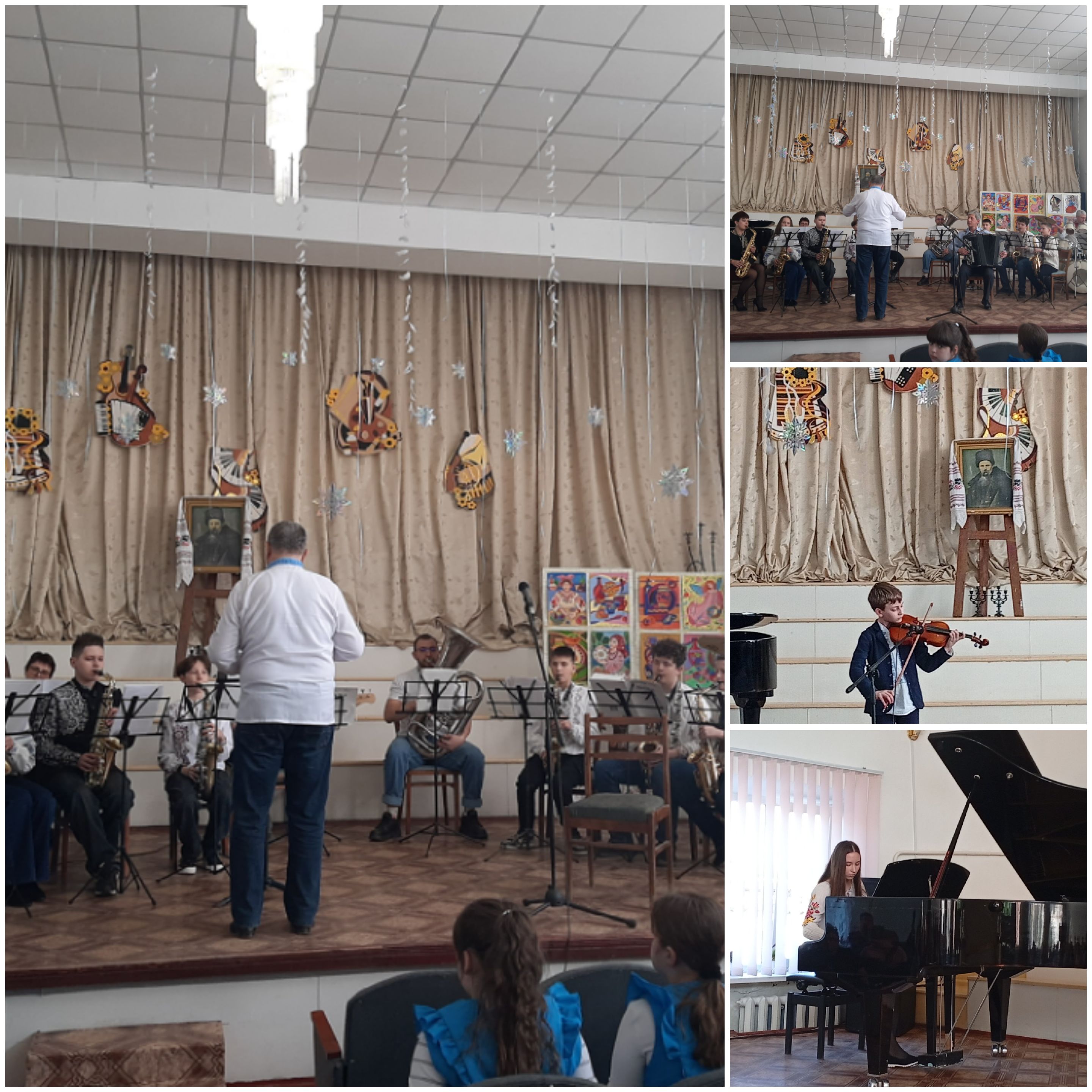 Колаж з фото - виступів учасників концерту, виставка малюнків.