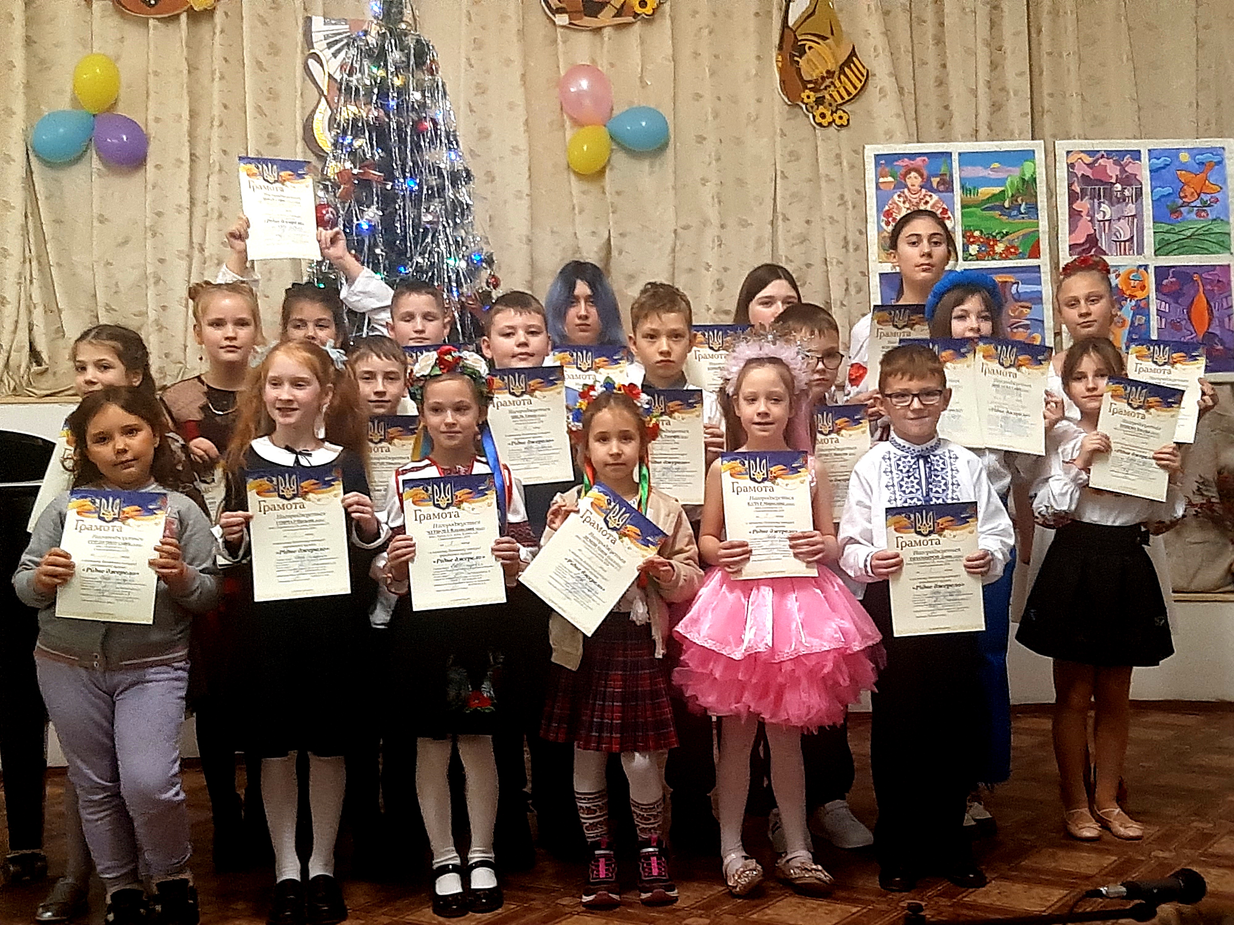 Діти стоять гуртом, тримаючи в руках грамоти. На задньому плані - прикрашена ялинка, кольорові кульки, виставка робіт художників, емблеми відділів школи.