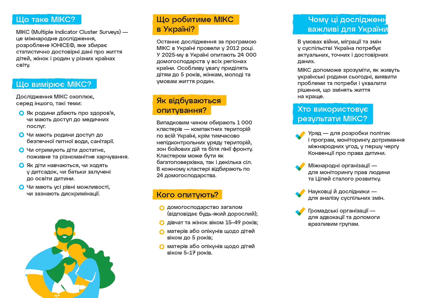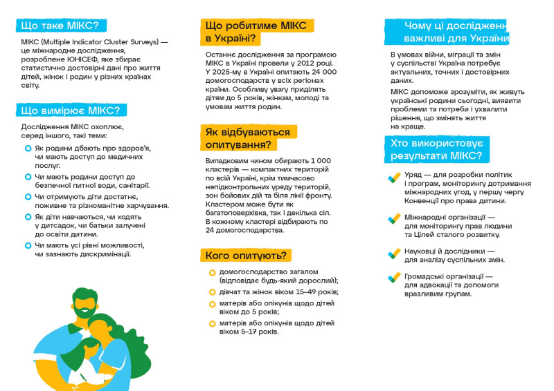 МІКС – це вибіркове обстеження домогосподарств, яке проводиться за міжнародною методологією та дозволяє отримати надійні дані для інформаційного забезпечення моніторингу становища дітей і жінок у сферах охорони здоров’я, освіти, безпеки, харчування, водопостачання та санітарії.