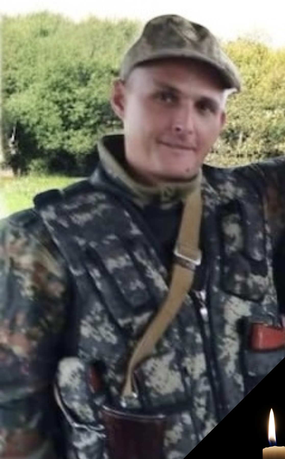 на фоні лісопосадки - молодий чоловік у військовій формі, зі зброєю. У правому нижньому куті - чорна стрічка та палаюча свічка.
