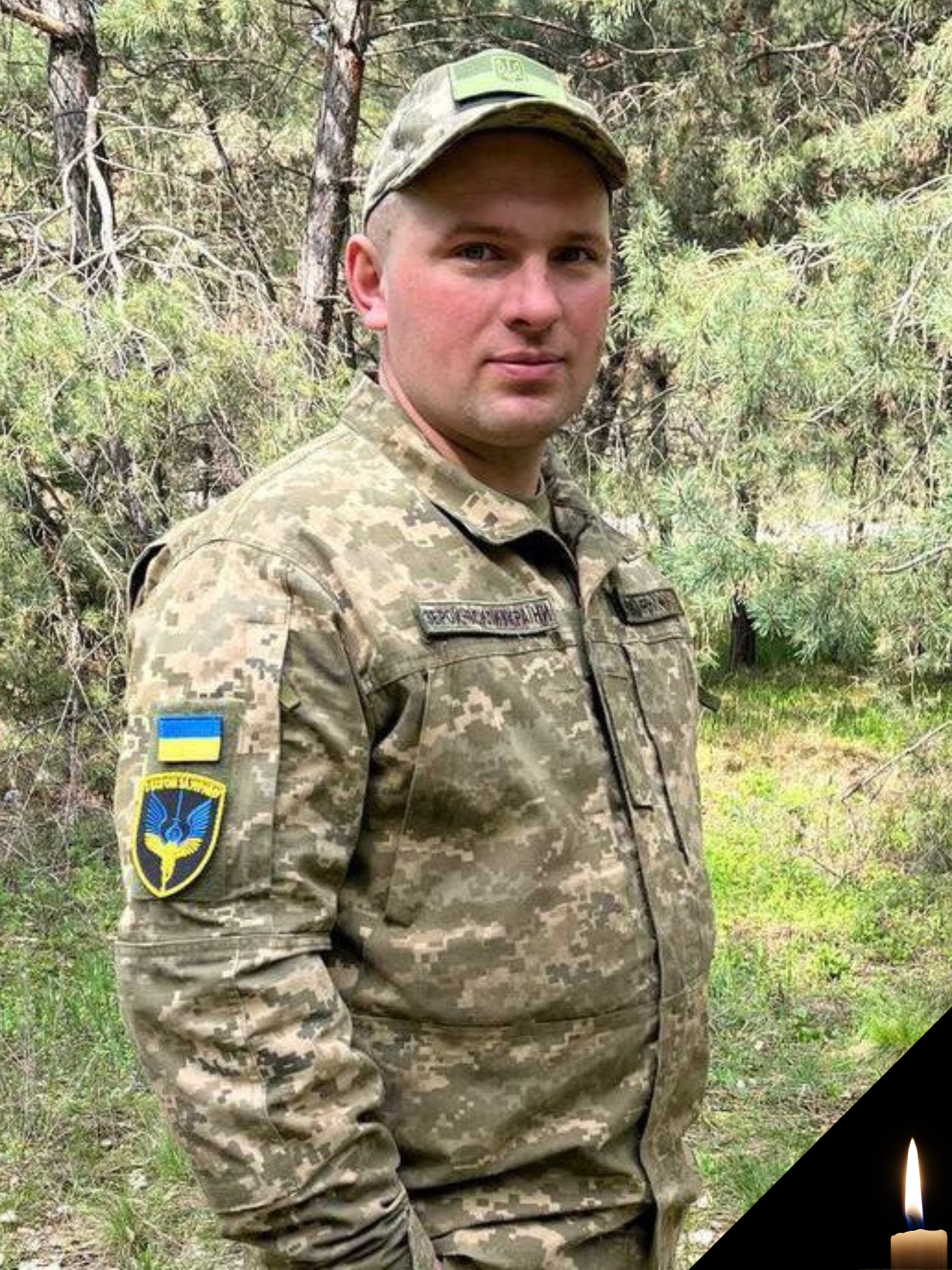 молодий чоловік у військовій формі стоїть на фоні хвойних дерев. У нижньому правому куті - чорна стрічка та палаюча свічка.