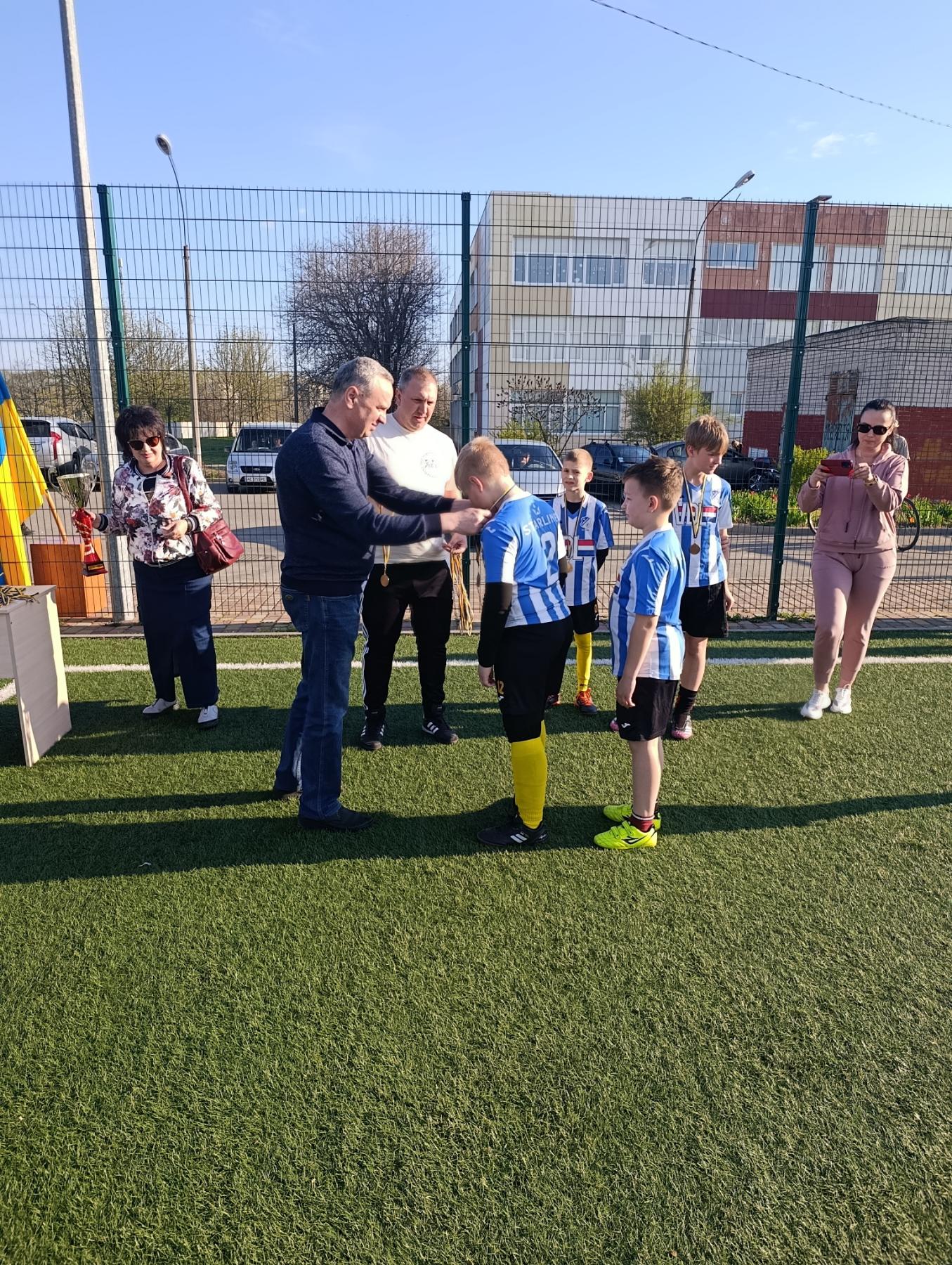 Міський голова надягає медаль юному футболісту. За цим футболістом стоїть інший. На задньому плані - матусі, організатори турніру.