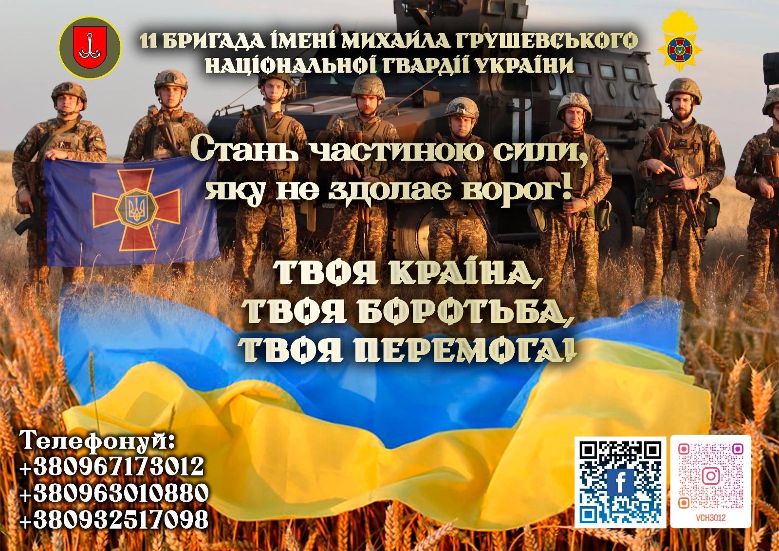 11 бригада імені Михайла Грушевського Національної гвардії України Покликаний захищати! Стати частиною сталевого щита для України! Якщо твоє серце палає за рідну землю, а душа прагне боротися за свободу, приєднуйся до лав 11 бригади ім. М. Грушевського Південного оперативно-територіального об'єдна…
