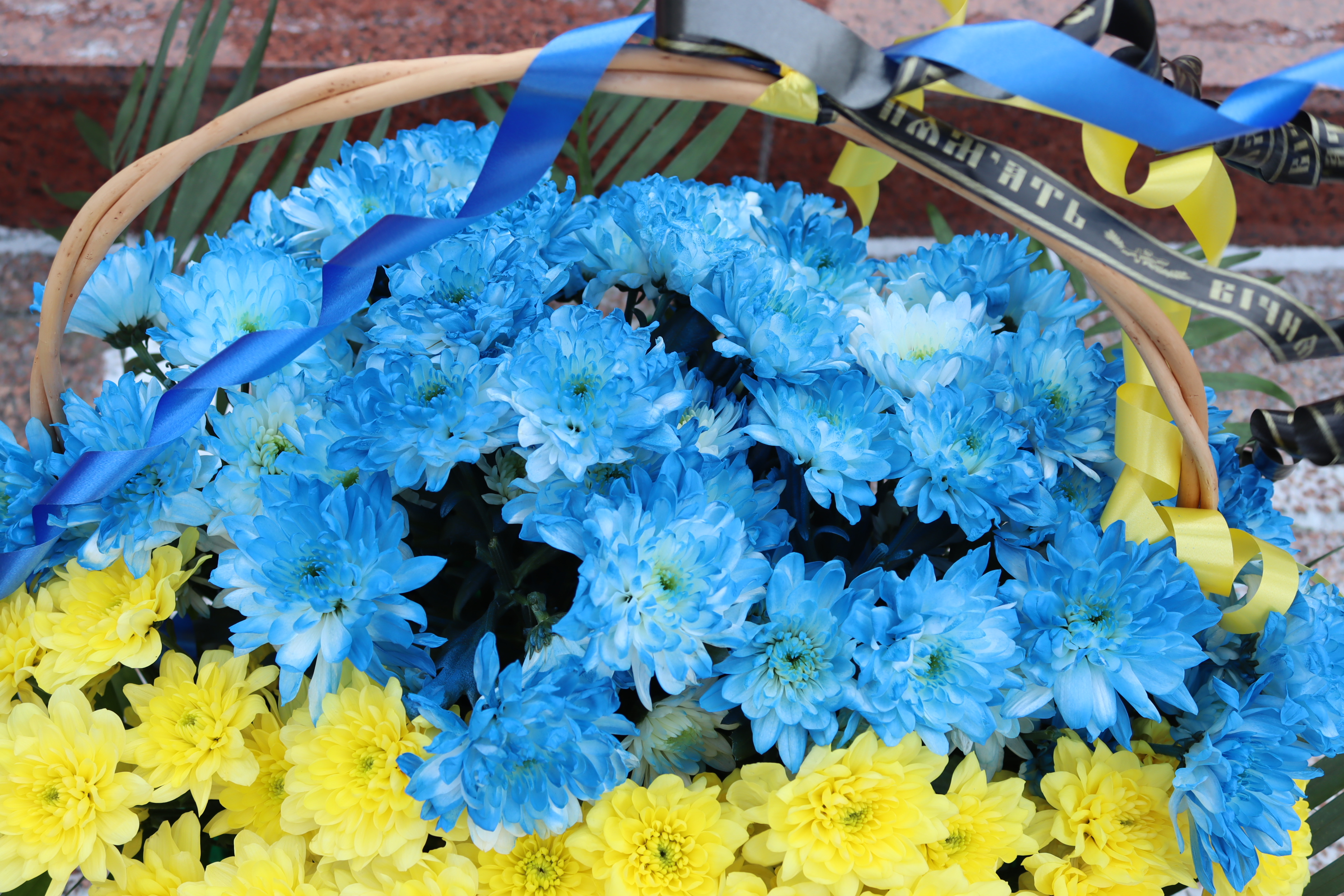 Кошик із синіми та жовтими хризантемами, синьою, жовтою та чорною стрічками.