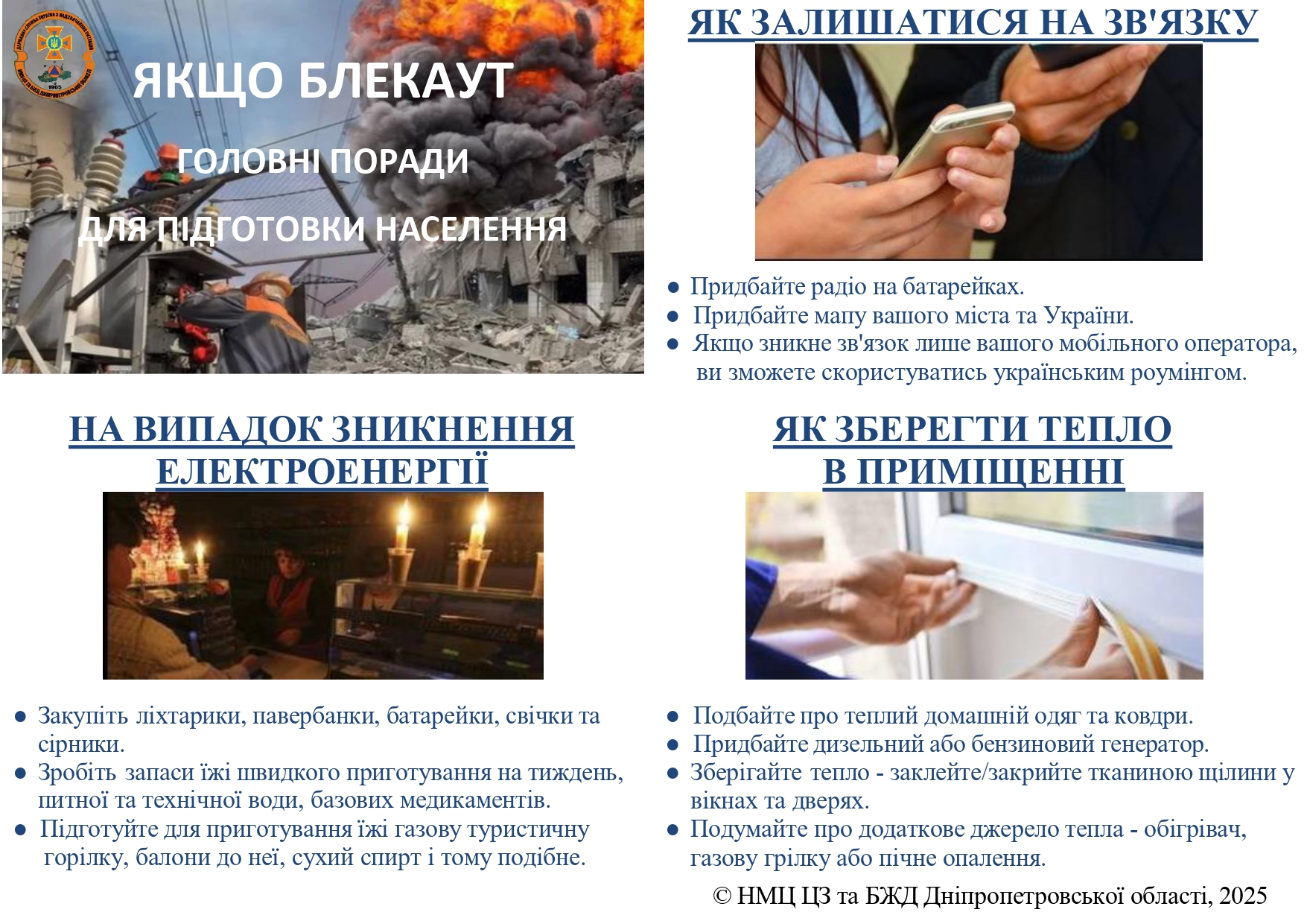Три блока з інформаціями і тематичними картинками: як залишитися на зв'язку, на випадок зникнення електроенергії, як зберегти тепло в приміщенні.