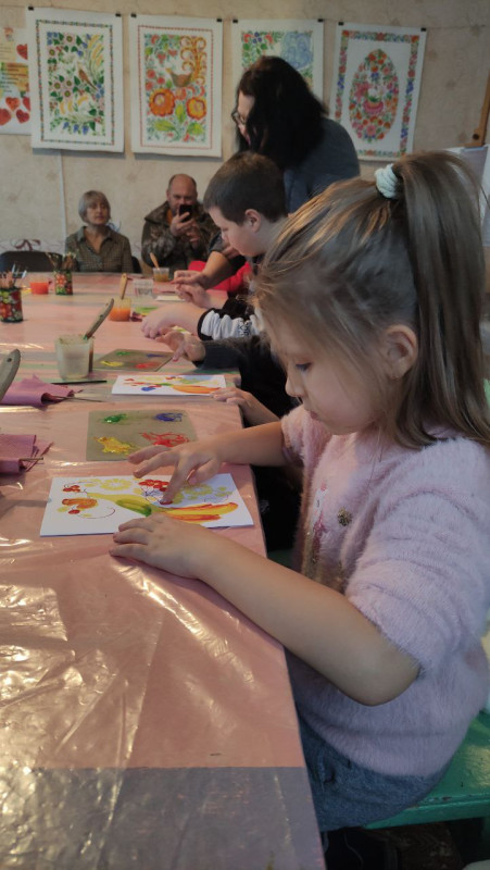 Спочатку Ганна Миколаївна познайомила дітей з азами мистецтва, зробили перші мазки. А вже потім приступили до створення своїх шедеврів. Наймолодшим залюбки допомагали дорослі, згадуючи свої навички.
