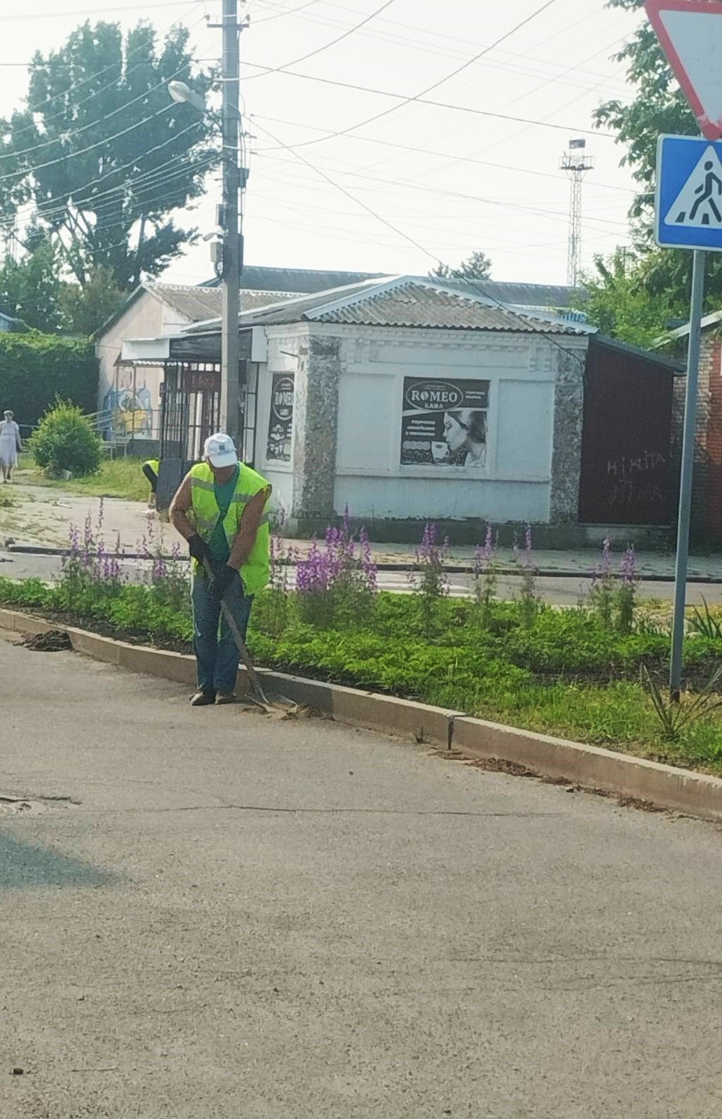 Жінки у жилетках прибирають мітлами вздовж пішохідної доріжки. За ними - трактор.