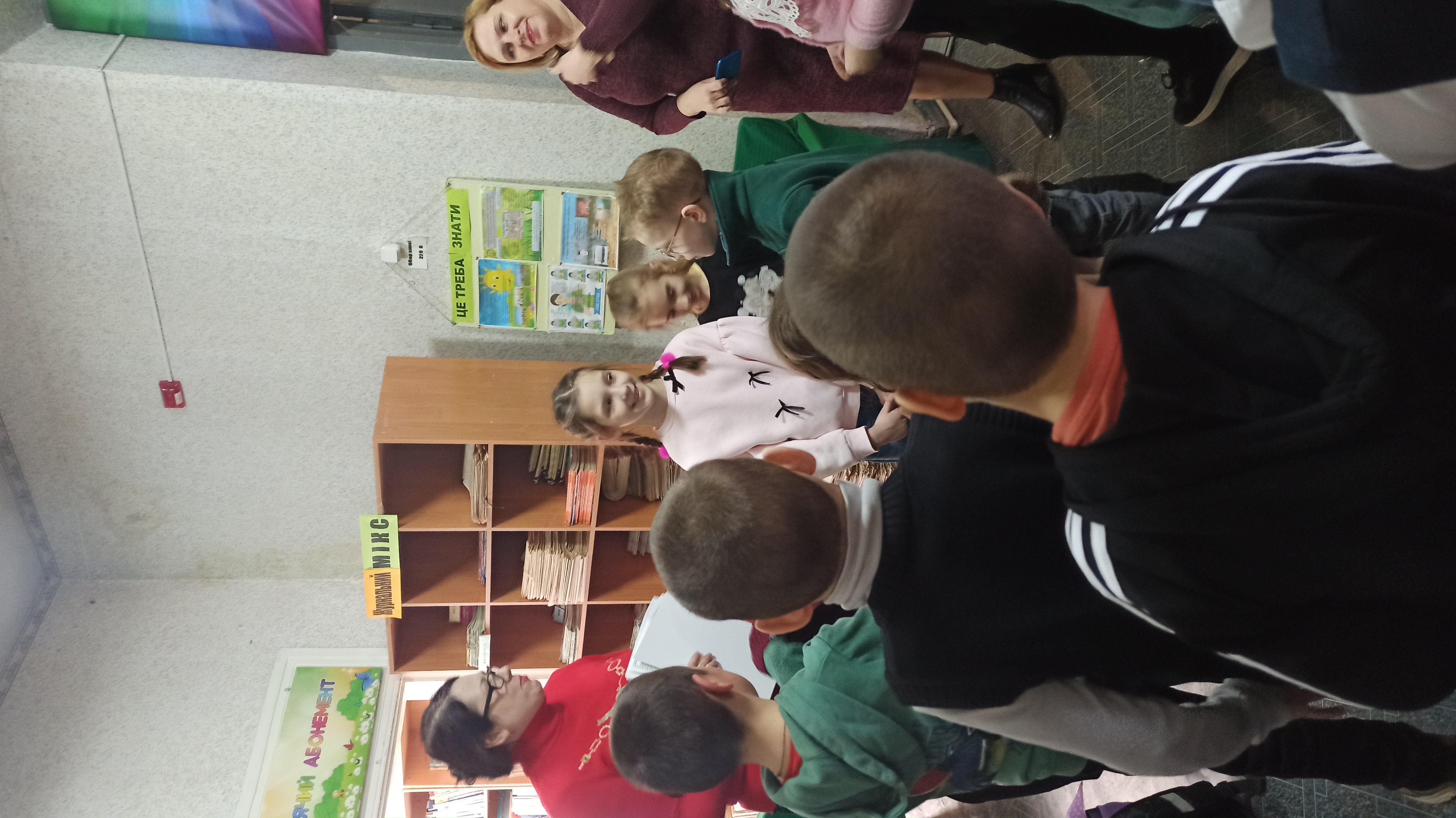 Діти у бібліотеці спілкуються з бібліотекарем. Поряд - класний керівник.