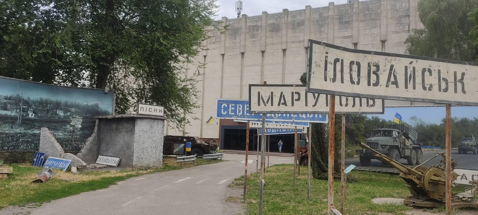 На задньому плані - будівля. До неї йде асфальтована дорога. Вздовж дороги праворуч стоять дорожні знаки з назвами населених пунктів: Іловайськ, Маріуполь, Северодонецьк та інші. Ліворуч - залишки зупинки із табличкою "Піски". За нею - велике фото у сірому тоні з краєвидом, уламки боєприпасів.