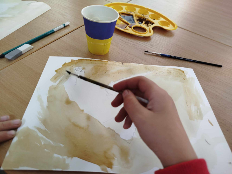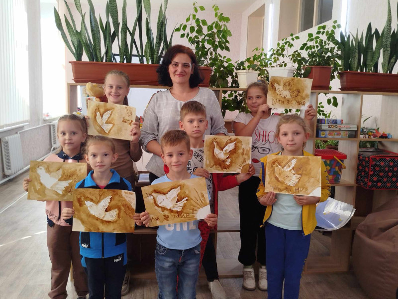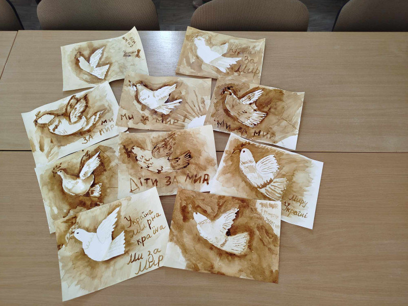 Тетяна розповіла дітям, як можна малювати кавою. Познайомила з історією виникнення техніки кавової акварелі, показала свої роботи. А потім діти з великим захопленням малювали самі. Кожен учасник створив свій власний шедевр – «голуба миру», як символ Перемоги!