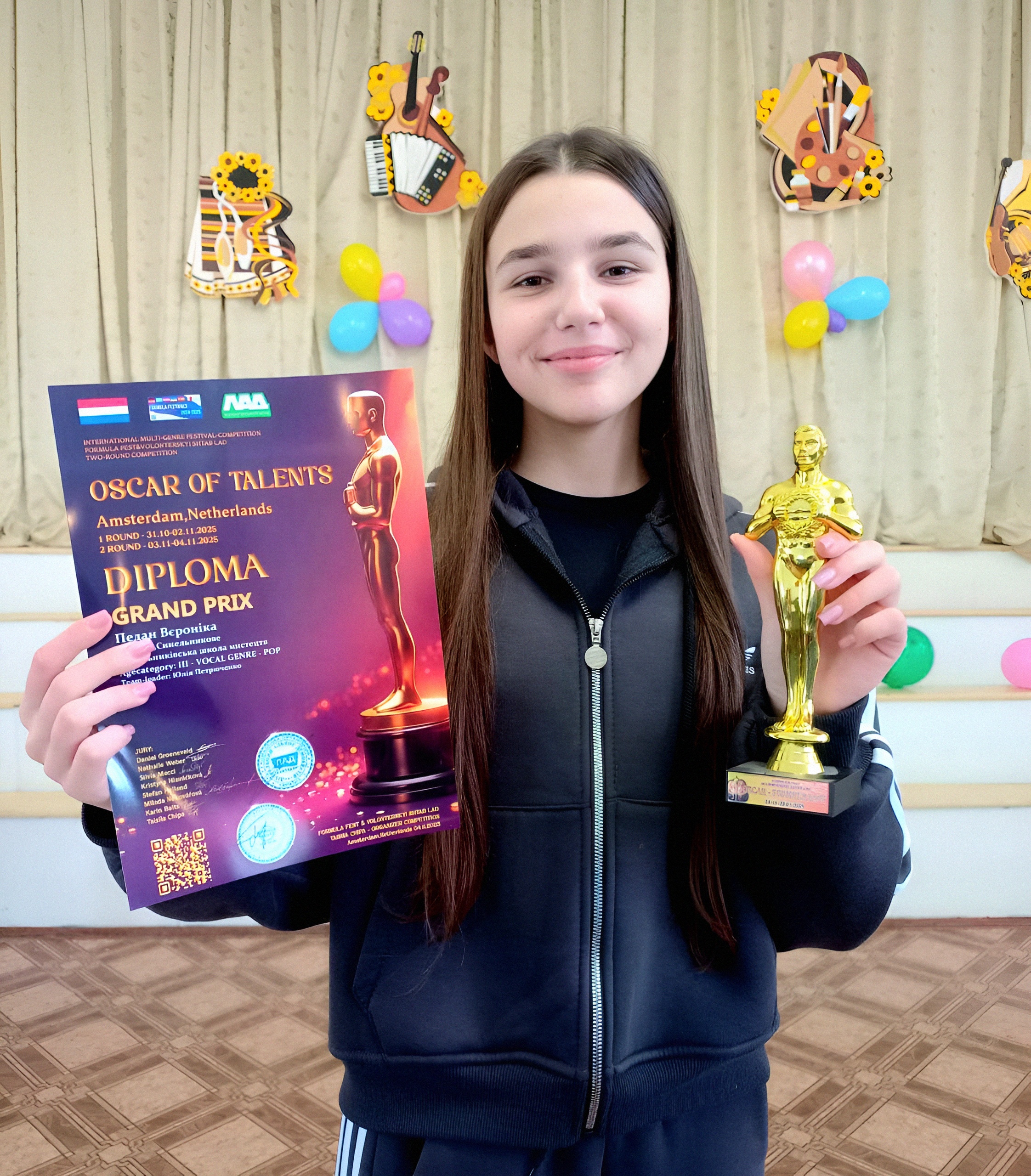Дівчина тримає в руках Диплом фестивалю «Оскар талантів» та статуетку. На задньому фоні - кольорові повітряні кульки, емблеми видів мистецтв, які вкладають у школі.