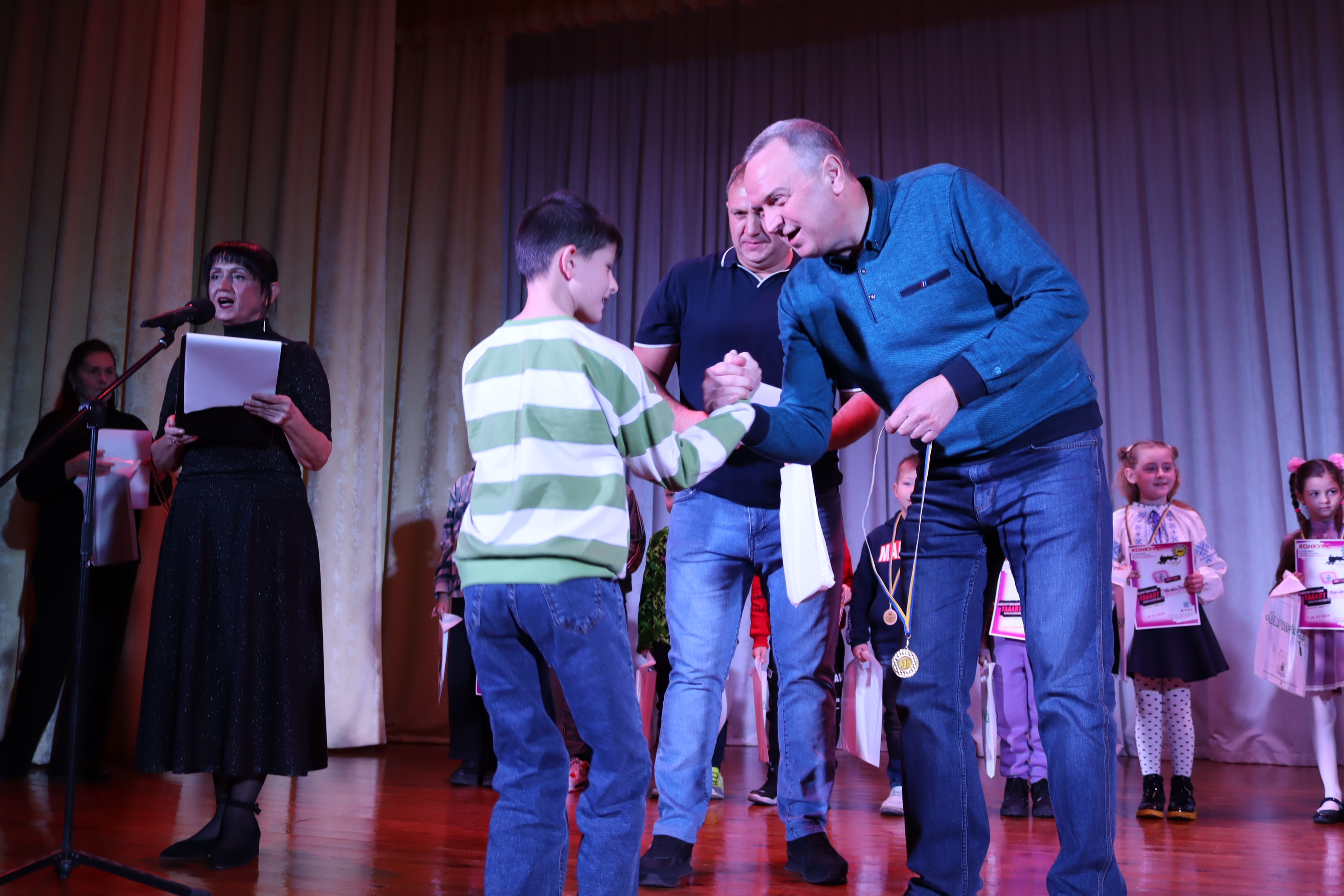 Міський голова вітає хлопця - переможця конкурсу, потискуючи йому руку.