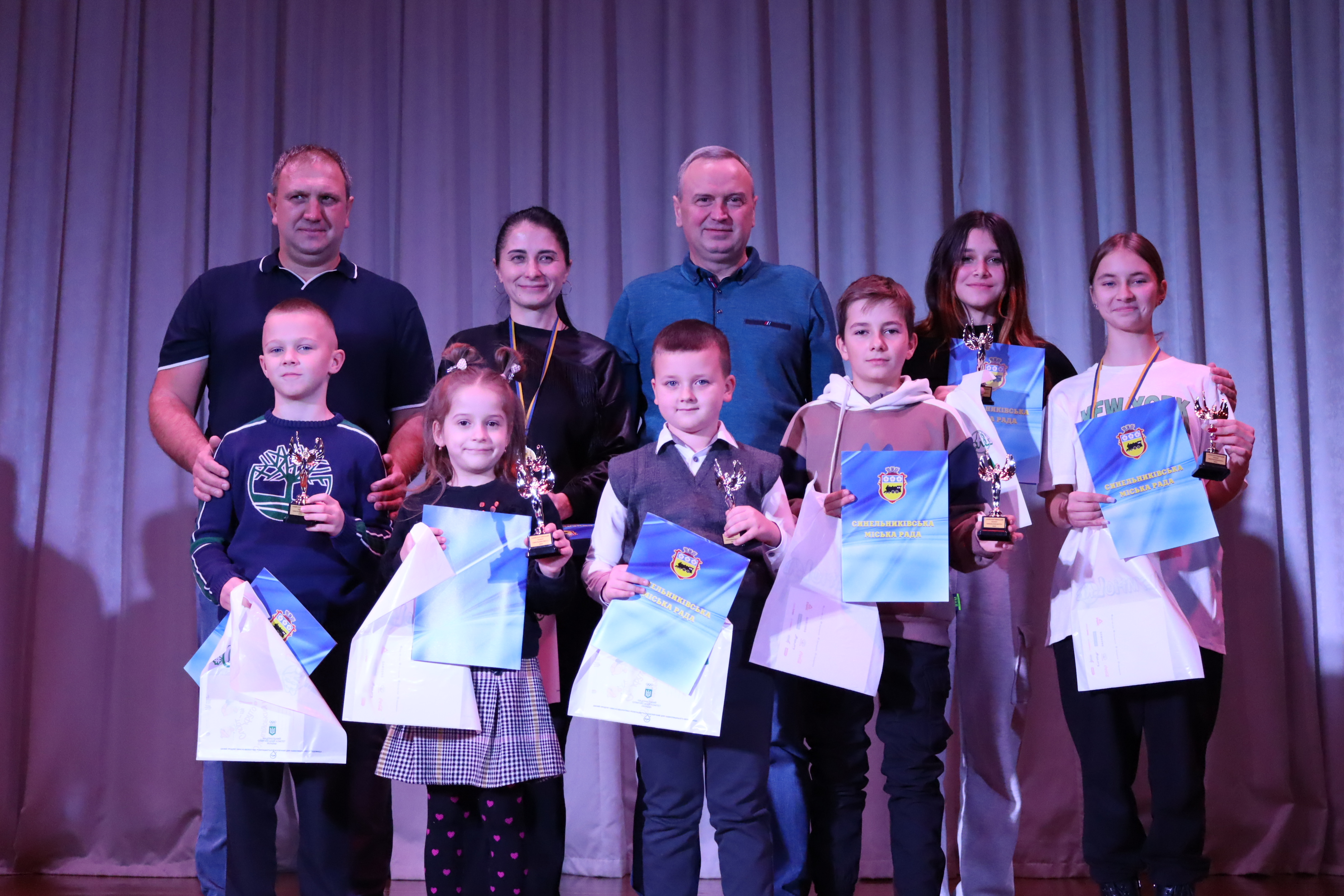 На фото - міський голова Дмитро Зражевський в оточенні переможців і призерів конкурсу. Серед них - діти, дорослі.
