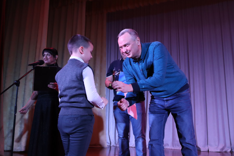 Міський голова Дмитро Зражевський спілкується з хлопчиком - переможцем конкурсу, міський голова в руці тримає медаль і сувенір для нагородження