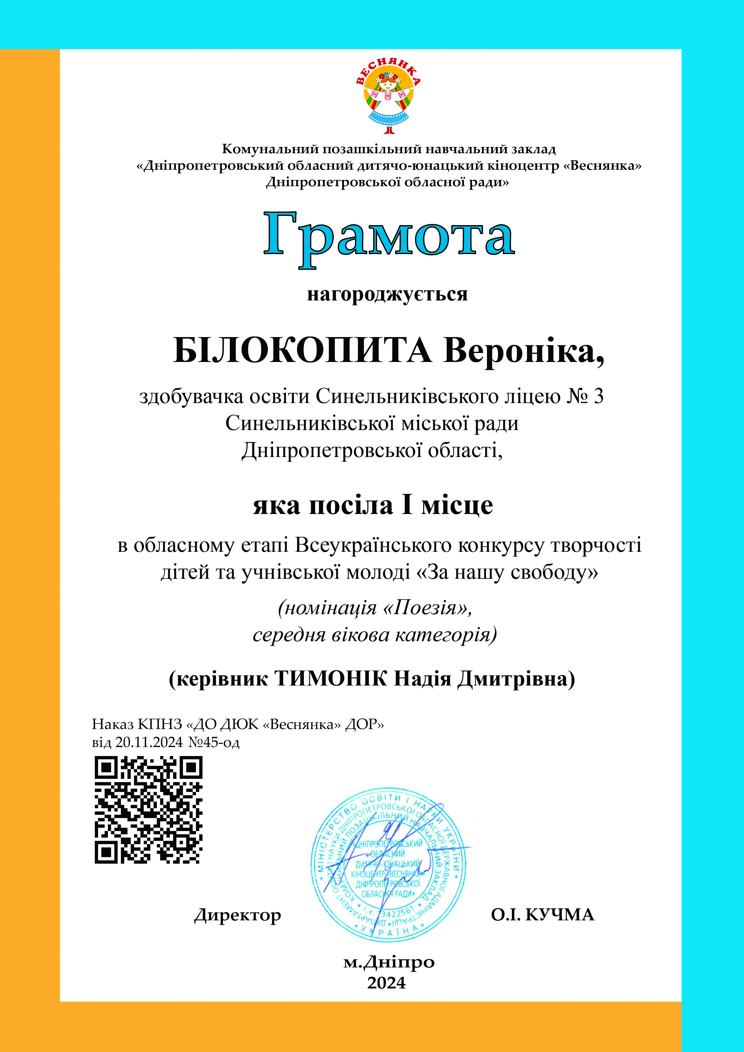І місце – Білокопита Вероніка (вчитель Надія Тимонік), ліцей № 3;