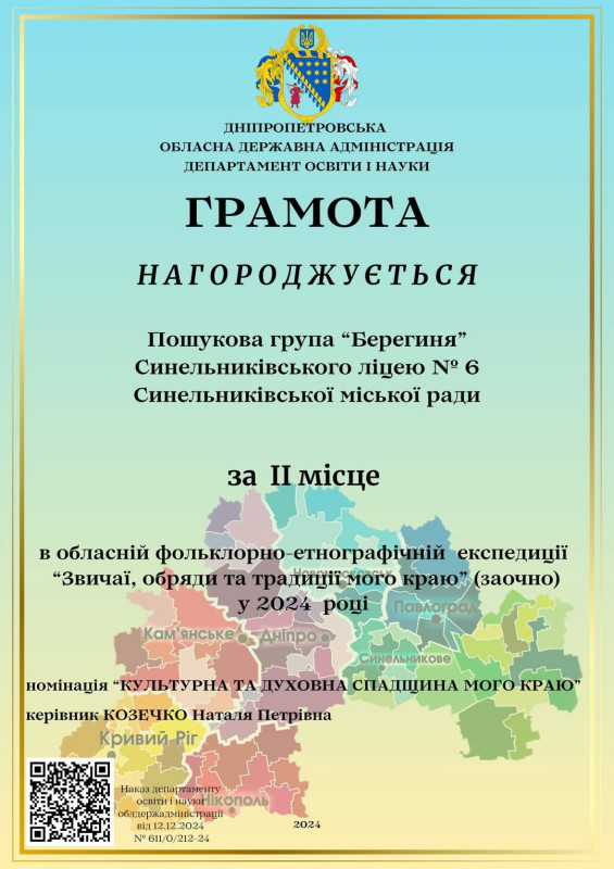 За результатами участі юних пошуковців у експедиції відділ освіти Синельниківської міської територіальної громади нагороджено грамотою Департаменту освіти і науки Дніпропетровської облдержадміністрації (ІІ місце) у номінації «Кращий район/місто».