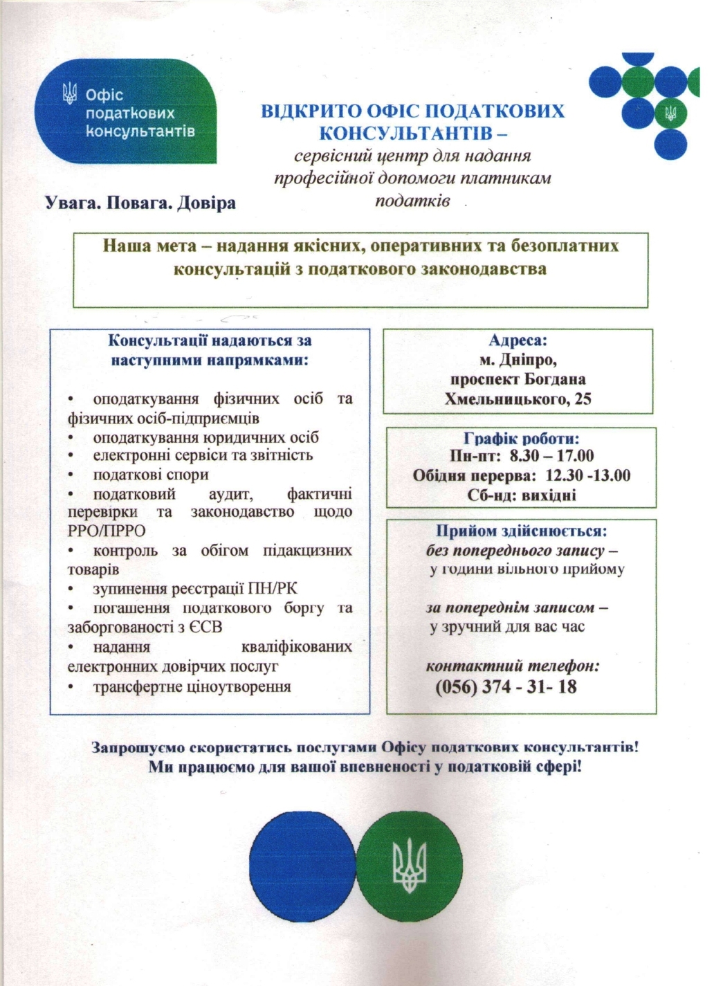Податкова інформує: відкрито офіс податкових консультантів - сервісний центр для надання професійної допомоги платникам податків