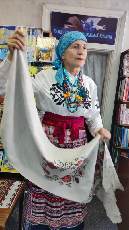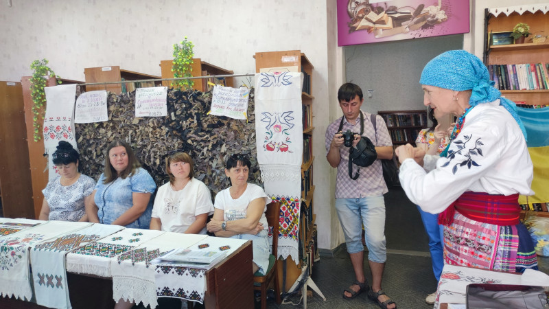 Майстриня нашого міста Тетяна Литвин до уваги відвідувачів представила вишиті рушники з власної колекції та творчі роботи вишивальниць міського клубу «Муліне». Розповіла про роль рушників в житті українців, обряди з їх використанням, а також про техніки вишивки та орнаментику.