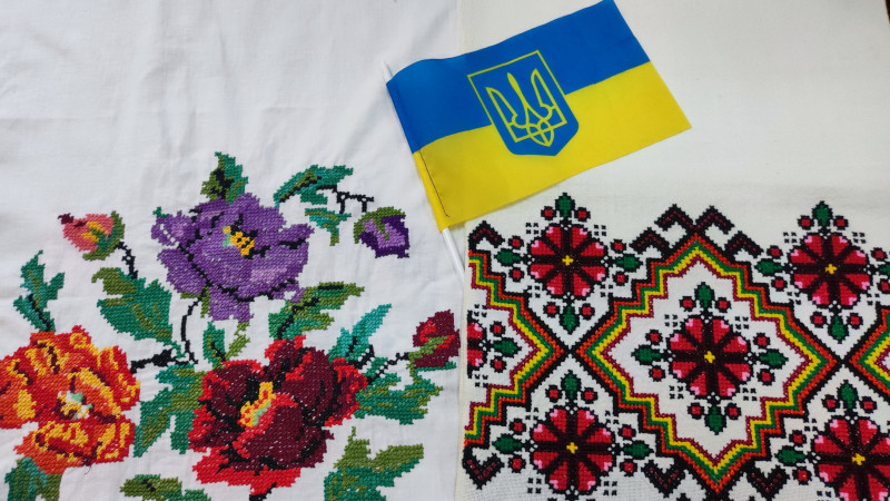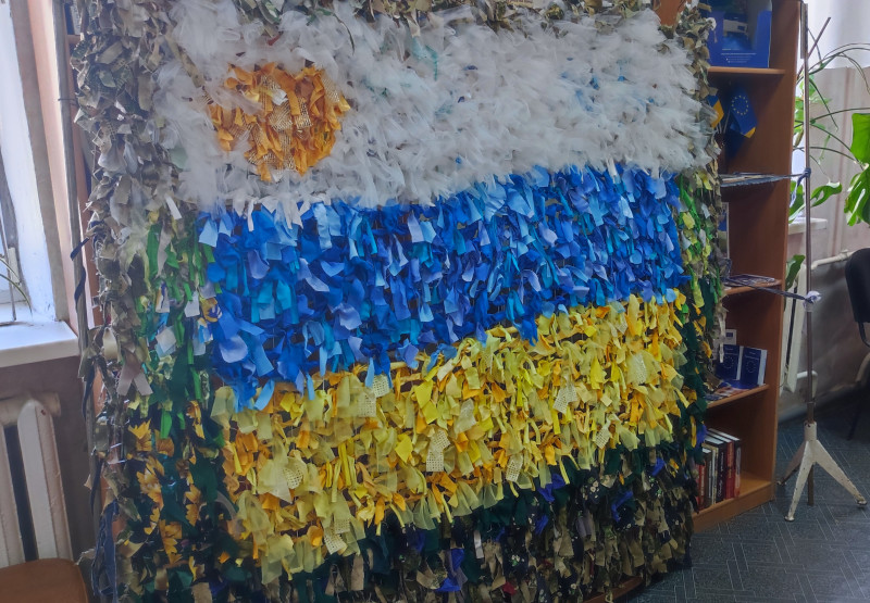 Також майстриня презентувала сітку «Прапор України», яку виконала в техніці маскувальної сітки до Дня Незалежності України. За задумом рукодільниці, над нашим прапором - Україною - чисте небо, де світить яскраве сонце, а по периметру - рамка піксельного кольору. Це значить, що Україна - під надійним захистом ППО, ЗСУ, Національної гвардії.