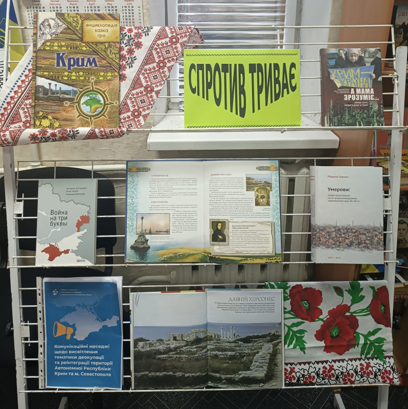 З метою поваги і підтримки хоробрості і героїзму усіх громадян України, які проживають на тимчасово окупованій території Криму у відстоюванні територіальної цілісності України, у міській дитячій бібліотеці презентована інформаційна виставка «Спротив триває». На полицях представлені літературні та інформаційні матеріали про минулу і сучасну історію спротиву наших громадян в Криму.