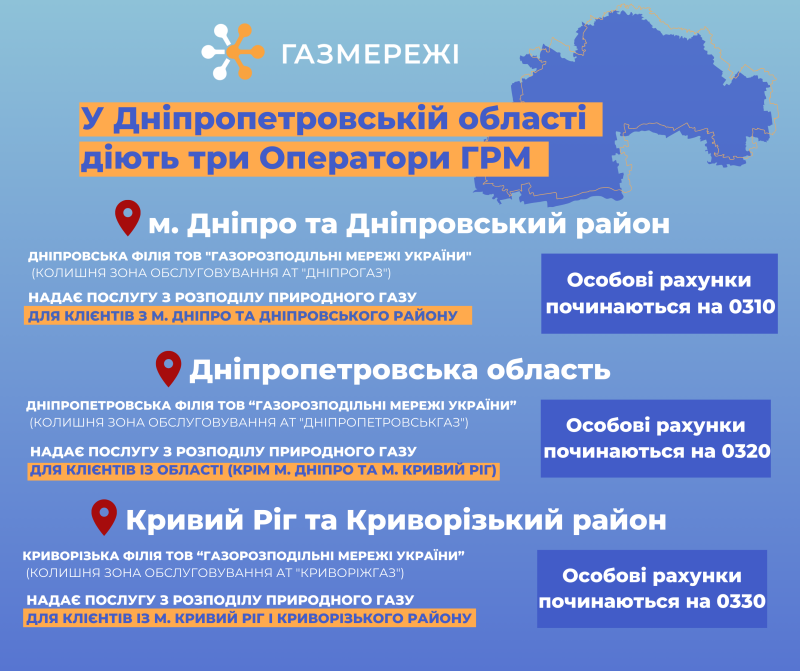 Споживачів газу області (крім м. Дніпро та м. Кривий Ріг) з особовим рахунком 0320… обслуговує обласний оператор - Дніпропетровська філія «Газмережі» (колишня зона обслуговування АТ «Дніпропетровськгаз»)