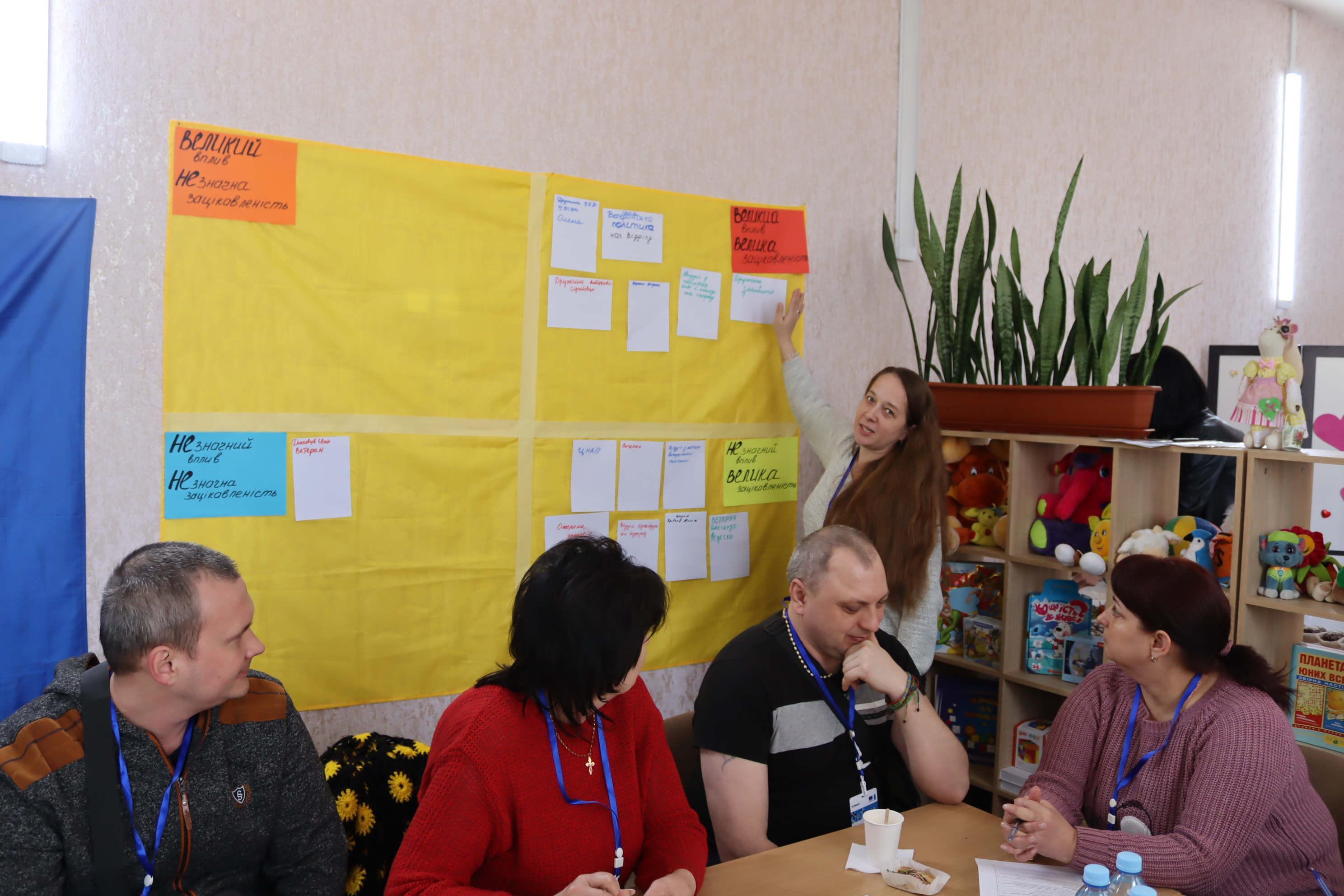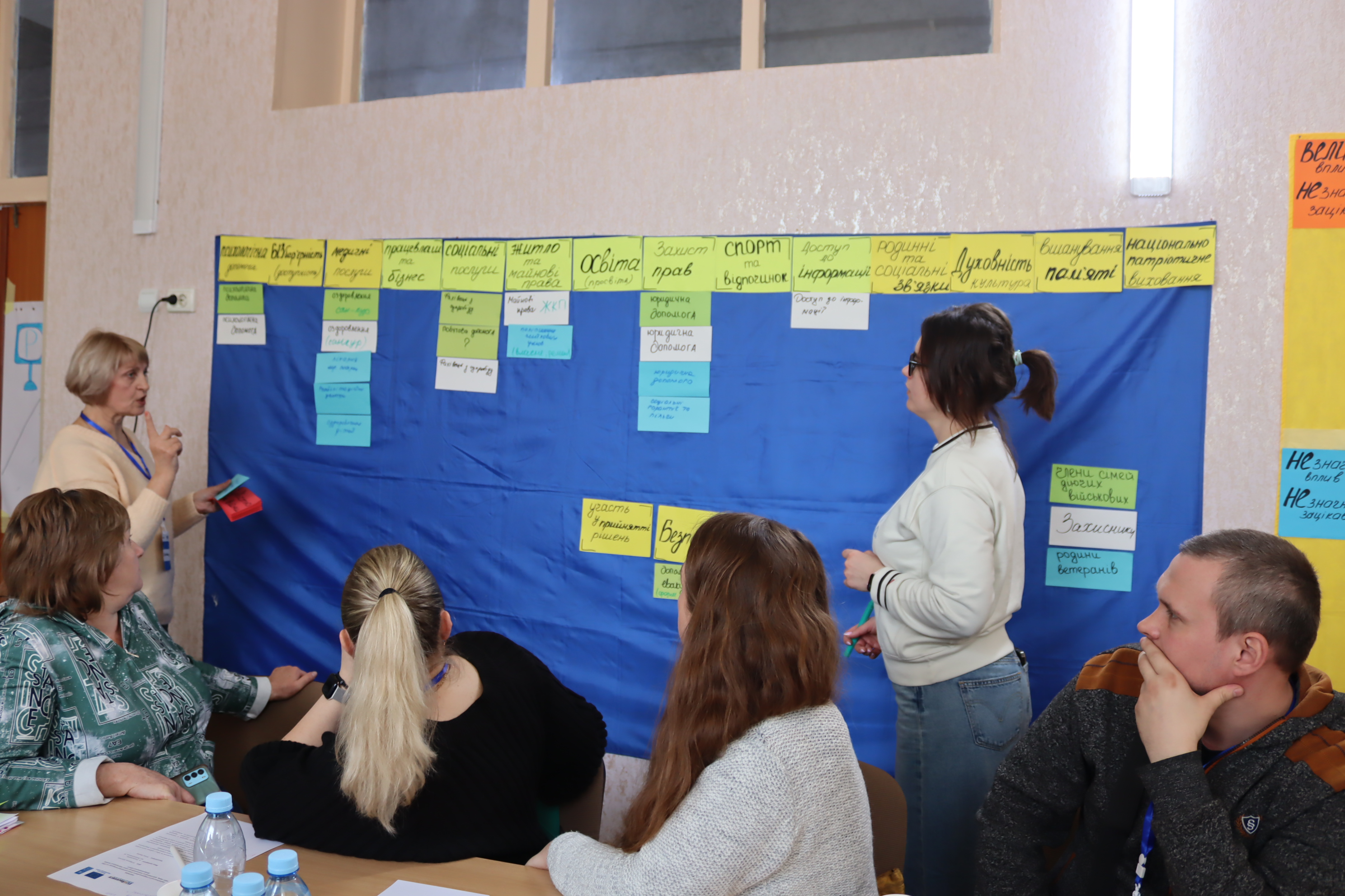 Триває обговорення серед учасників заходу, які сидять за столом. Серед них - чоловіки, жінки. На столі - пляшки з водою, стаканчики, аркуші паперу, кольорові маркери, жовті та оранжеві картки (як чисті, так і з написами). На задньому фоні - синє та жовтє полотна з різними картками.