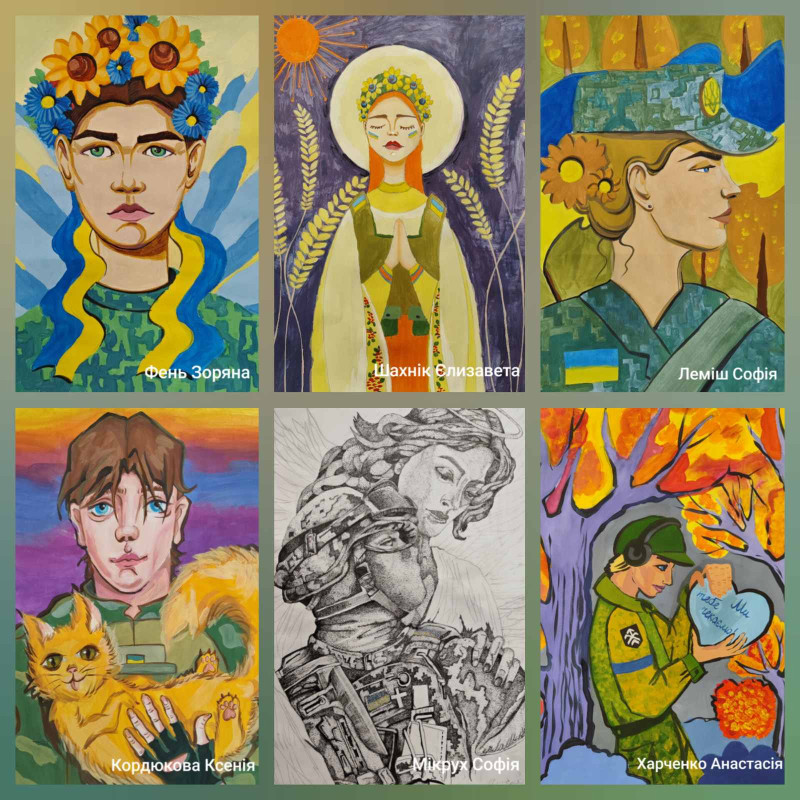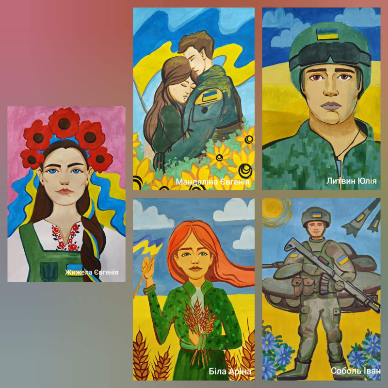 Сьогодні школа демонструє тематичну творчу виставку робіт учнів молодших та старших класів образотворчого мистецтва «Мій надійний Захисник».