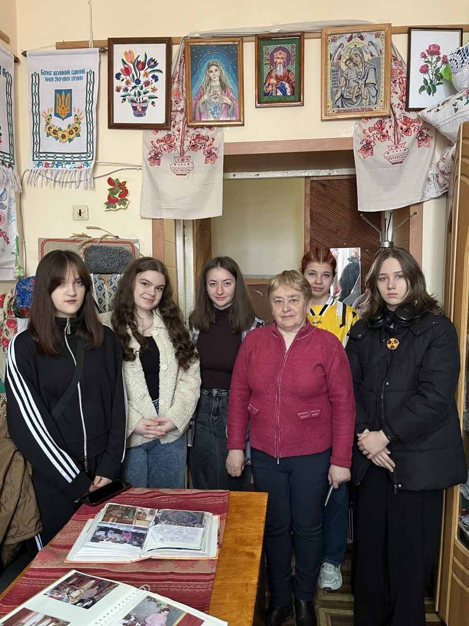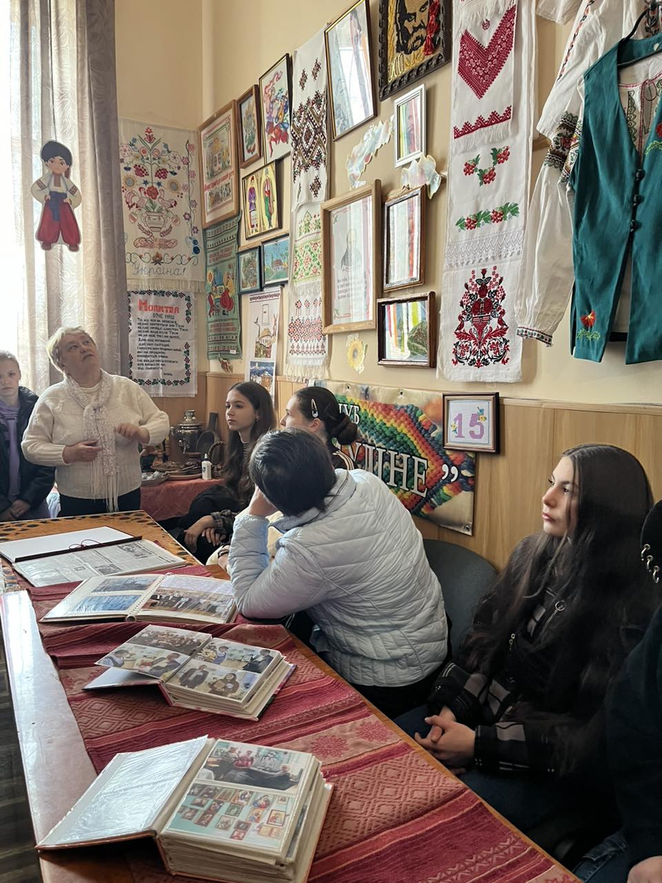 Керівник клубу "Муліне" Людмила Савченко розповідає дітям про експонати виставки - вишиті рушники, картини, що висять на стіні. Слухачі сидять за столом, інші - стоять поруч. На столі лежать альбоми з фото.