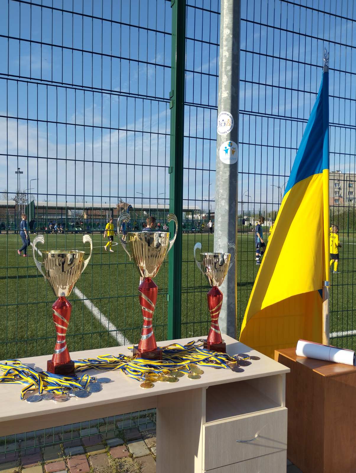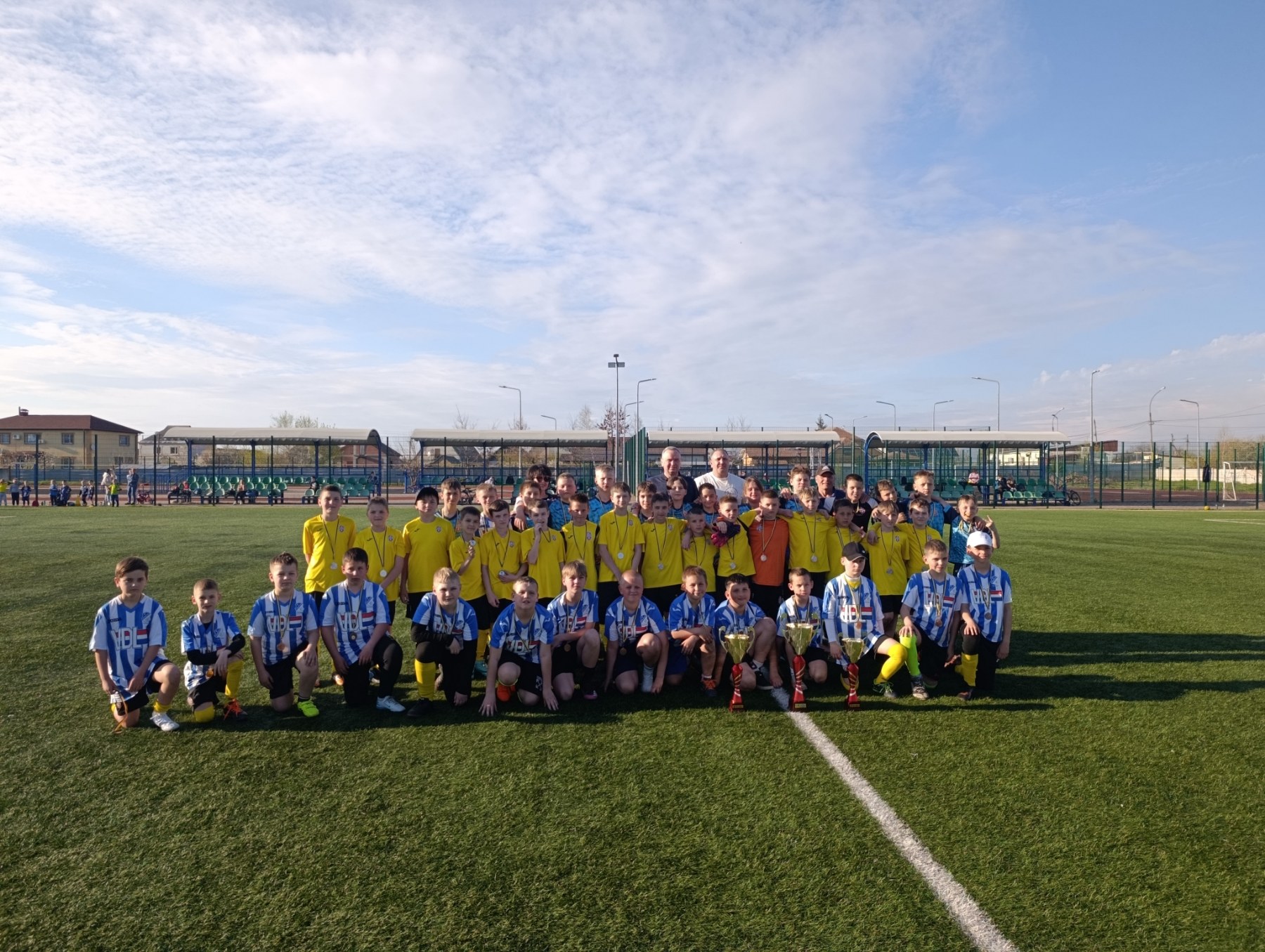 Команди разом стоять на полі. Діти з медалями, кубками. Разом із дітьми - міський голова, тренери, організатори турніру.