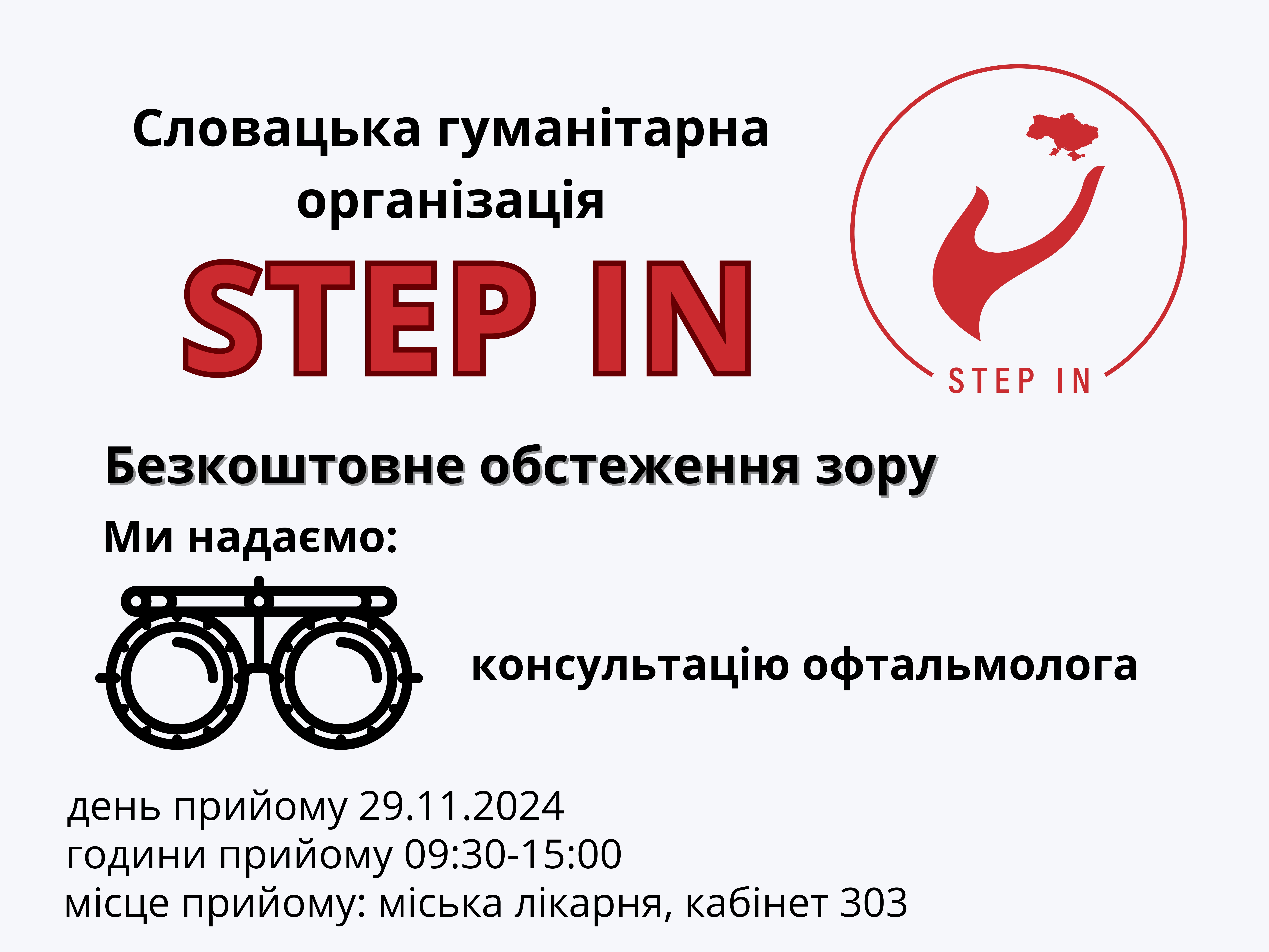 Словацька гуманітарна організація STEP IN надає для всіх бажаючих безкоштовну консультацію офтальмолога!Перевірити свій зір можна, звернувшись до центральної міської лікарні, кабінет № 303 поліклініки. Дата прийому: 29 листопада 2024 року.Часи прийому: 09.30-15.00.Без попереднього запису та направл…