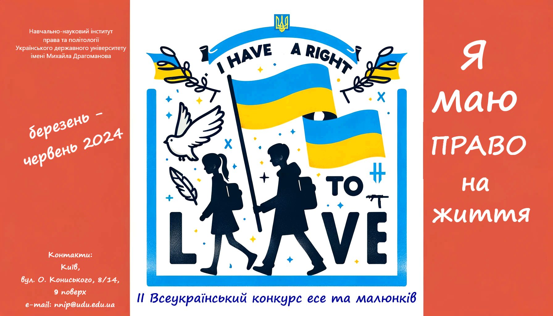 У березні-червні 2024 року Навчально-науковий інститут права та політології УДУ імені Михайла Драгоманова за підтримки міністерств і відомств проводить ІІ-ий Всеукраїнський конкурс есе та малюнків «Я маю ПРАВО на життя».Конкурс – це відкритий захід, що проводиться з метою привернення уваги до поруш…